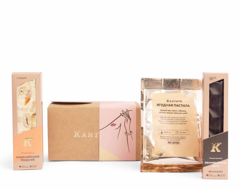 Изящный презент для ценительницы чая. В набор мы положили купаж на основе черного чая «Ягодная пастила», а на десерт в подарке найдется нуга и тающая во рту плитка шоколада.