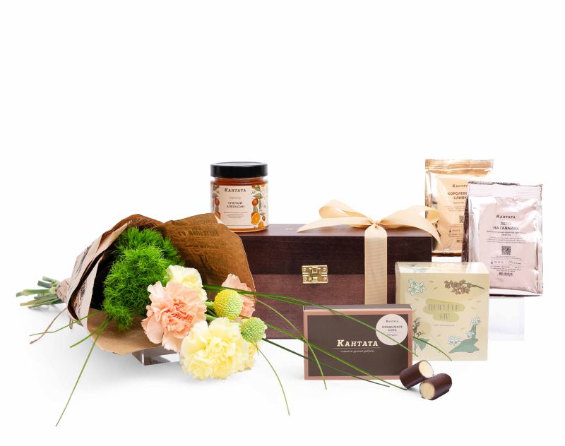 Великолепная шкатулка, которая станет незабываемым подарком наставнику! Набор мы украсили композицией из живых ароматных цветов, дополнили его тремя напитками — гречишным чаем с уютной нотой сливочного печенья, купажом черного чая «Королевские сливки» с ванильно-сливочным оттенком и смесью «Лето на Гавайях» из солнечных фруктов и цветочных лепестков. К напиткам — набор марципанов в темном шоколаде и аппетитный мармелад «Спелый апельсин» в баночке.