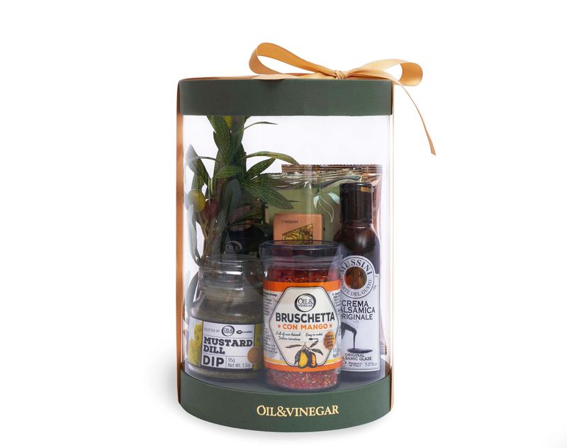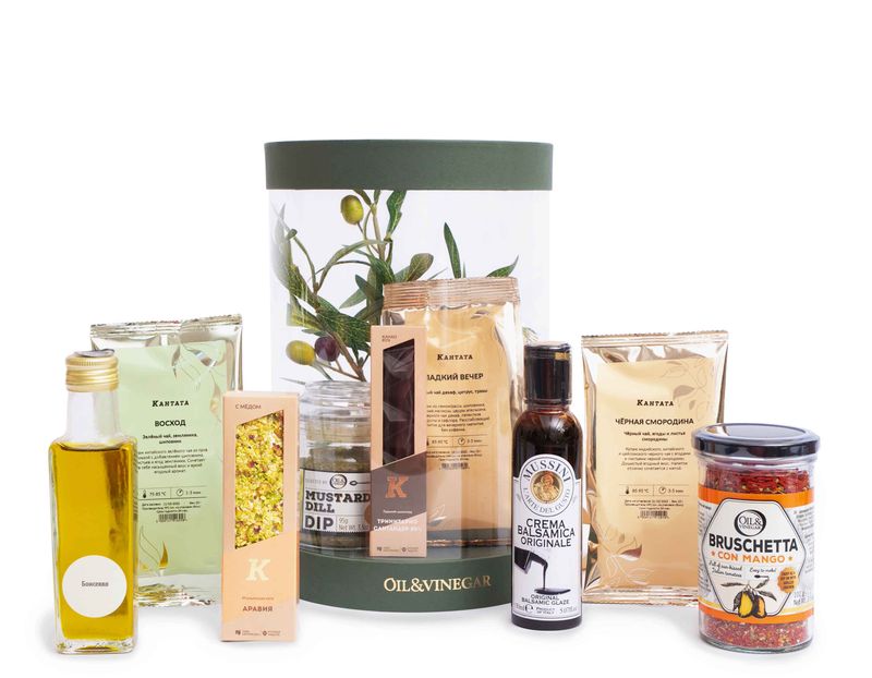 Изящная шляпная коробка, в который мы собрали гурмэ-ингредиенты высшего качества. В набор положили две специи – «Брускетту с манго» и «Дип из горчицы с укропом», ароматное оливковое масло «Бонсекко» и классику любого застолья – густой бальзамический уксус. Дополнили подарок тремя напитками – успокаивающим купажом «Сладкий вечер», купажом черного чая «Черная смородина» и смесью на основе зеленого чая «Восход» с ягодами. На десерт в наборе найдутся нежная нуга и шокобар – классический горький шоколад.