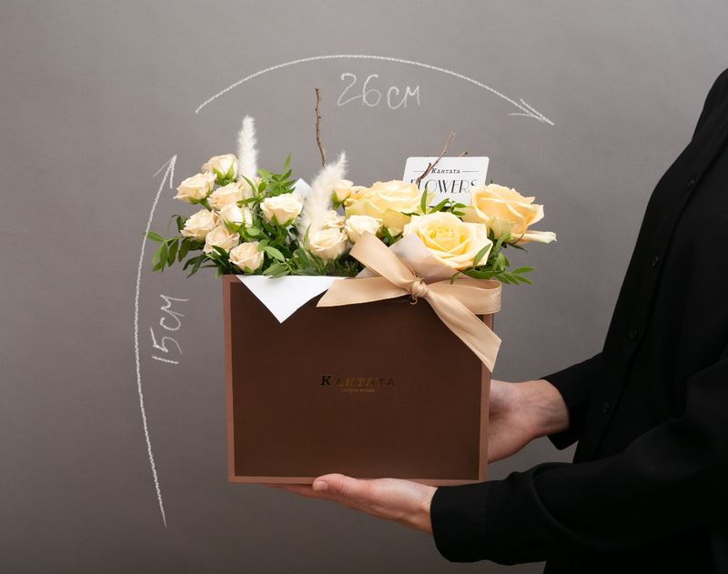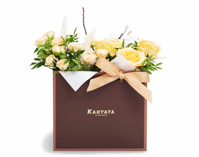 В сумочке, украшенной тематической биркой, найдется целый букет живых роз, украшенный тростником и веточками фисташки.