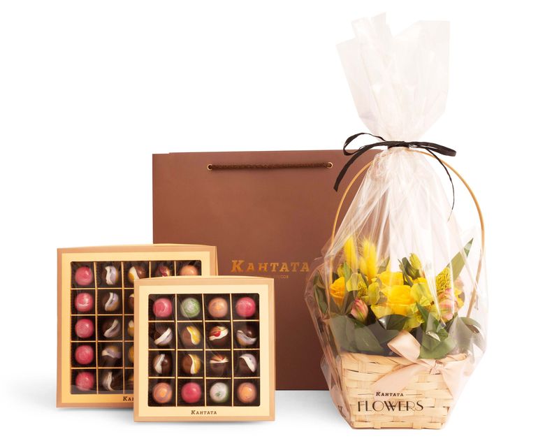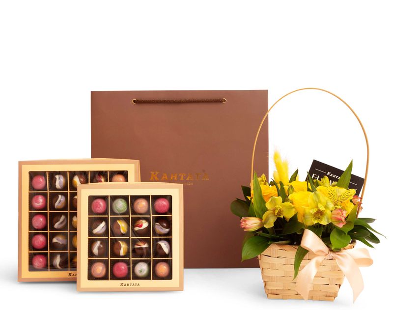 Благоухание живых цветов и тающие во рту десерты – с таким подарком Ваш знак внимания точно не окажется незамеченным! В элегантную сумочку мы положили два набора трюфелей и конфет, а изюминкой подарка станут живые цветы, которые можно поставить в вазу.