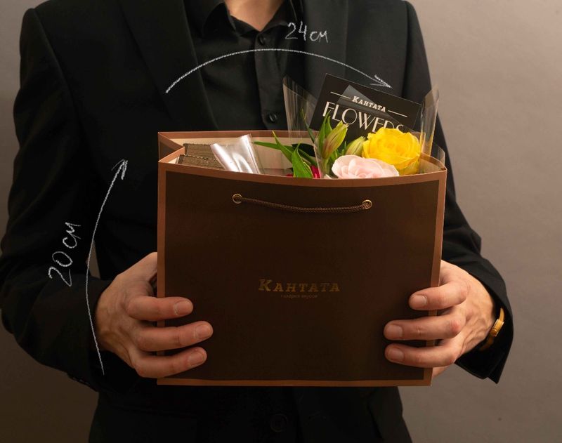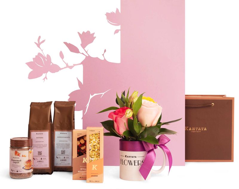 Сумочка, полная приятных сюрпризов! Помимо целого букета благоухающих живых цветов в набор мы положили кофе сорта «Эспрессо Масалто» с природной нотой молочного шоколада, десертный сорт «Фисташка» с богатым оттенком орехового ликера, а также сорт в растворимом формате «Кленовый сироп». На десерт в наборе найдется воздушная нуга и тающая во рту плитка шоколада с фундуком и ягодами.