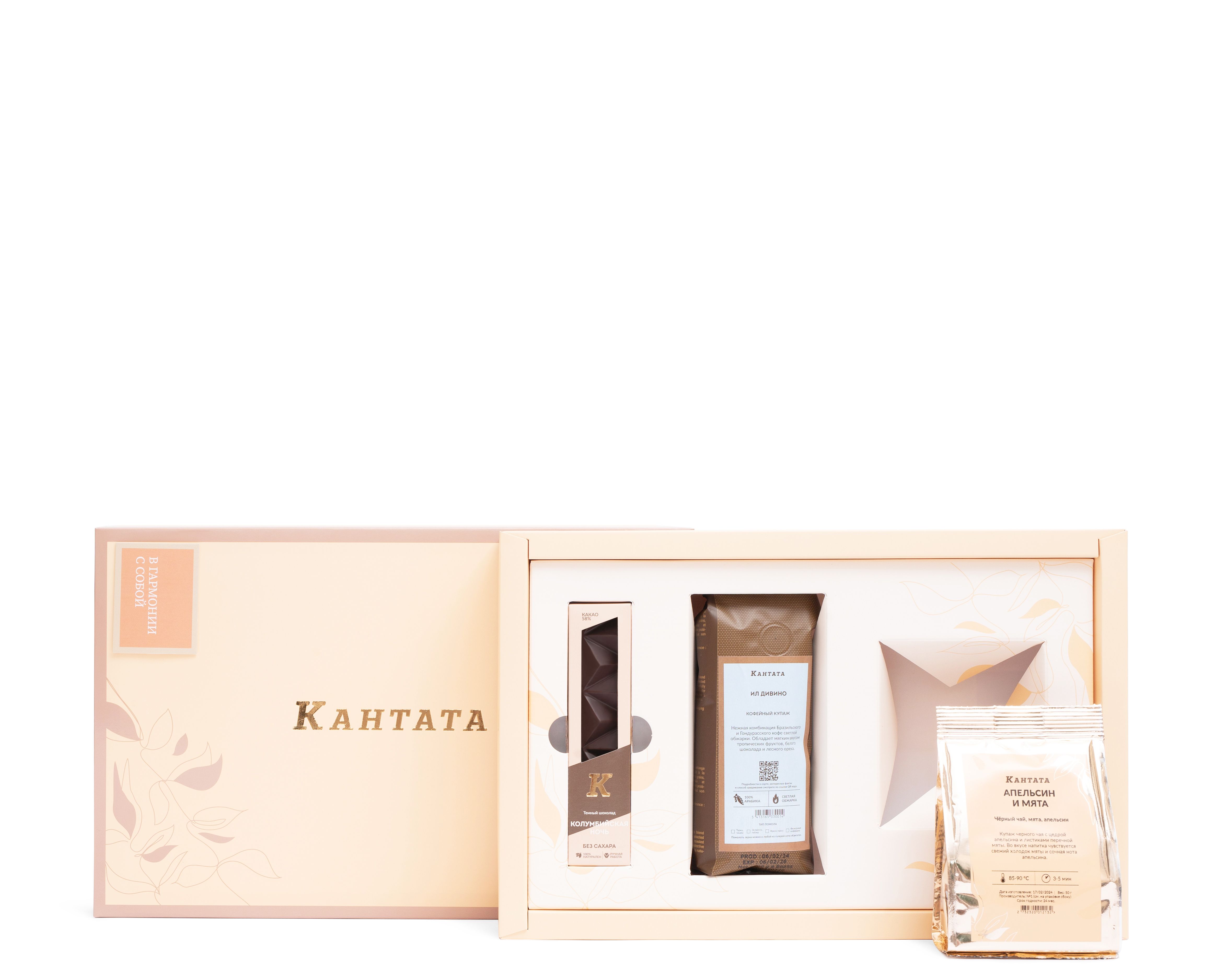 Чай, кофе и десерт для того, кто любит все и сразу! Внутри набора — купаж черного чая «Апельсин и мята» с освежающим пряным ароматом и классический кофе Ил Дивино с мягким вкусом лесного ореха, шоколада и фруктов. Насыщенный темный шоколад из лучших какао-бобов Южной Америки выгодно подчеркнет грани согревающих напитков.
