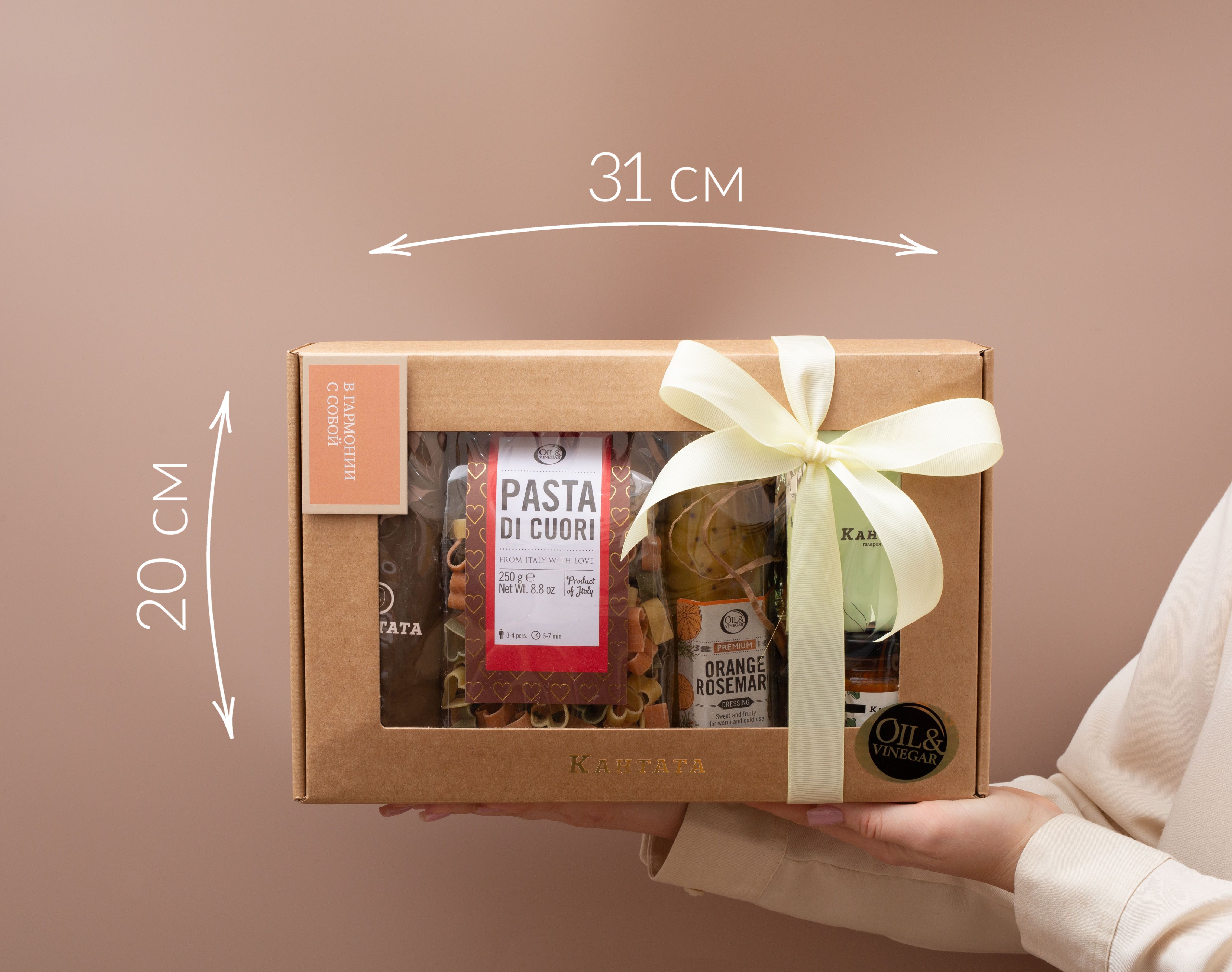 Гурмэ-удовольствие обеспечено! Внутри подарка — изысканная паста в форме сердечек, а к ней — ароматная заправка с апельсином и розмарином и икра из баклажанов с дымком. После сытного ужина — уютное чаепитие или бодрящий кофе-брейк с зеленым чаем «Манго-Розмарин», черный чаем «Миндальный бисквит» или зерновым «Кофе для свидания».