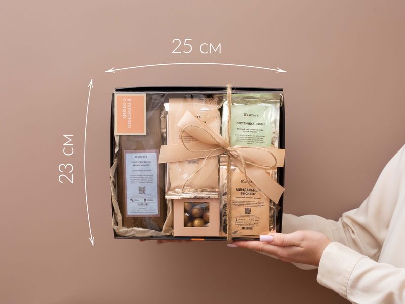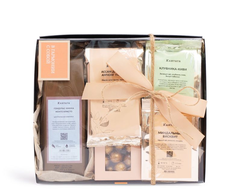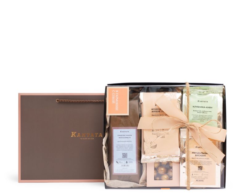 Все вкусы подарка — как на ладони! Внутри — авторский купаж черного чая «Таежный» с ароматом хвойного леса и черный чай «Миндальный бисквит» с уютным вкусом выпечки. Также в подарке — классический индийский чай Ассам Джамун Амчонг с нотой дикого меда и купаж зеленого чая «Клубника-Киви» — тропическая противоположность Ассама. Набор мы дополнили классическим кофе Гондурас Финка Монте Кристо с природной хлебной нотой, а также коробочкой драже с фундуком и фисташкой.