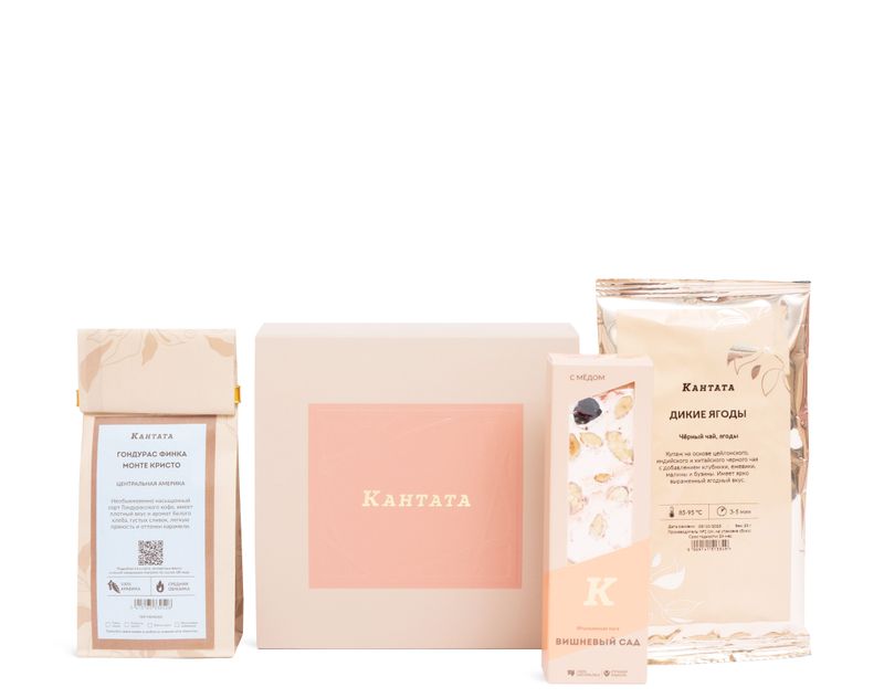 Эстетика и вкус для того, кто выбирает лучшее! Внутри — купаж черного чая «Дикие ягоды» с приятной кислинкой ежевики и классический кофе Гондурас Финка Монте Кристо с теплыми хлебными нотами. Нуга с сочной вишней на десерт прекрасно дополнит вкусы согревающих напитков.