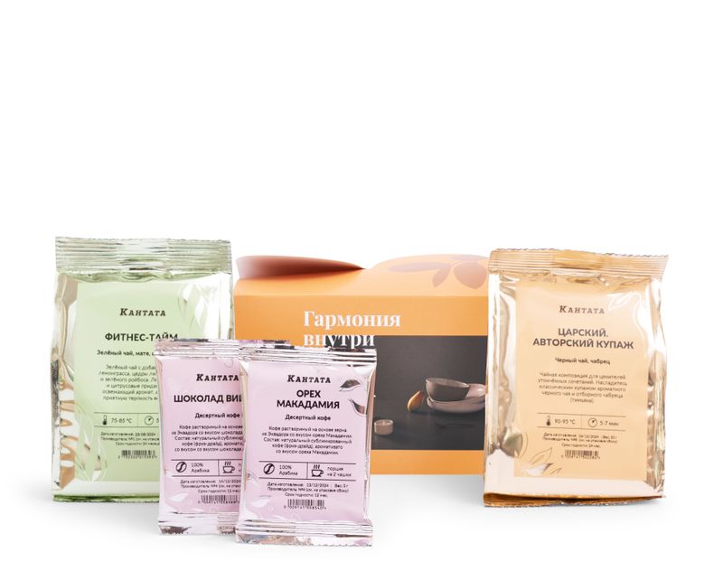 Пусть гармония и баланс будут во всем! Дополнит их подарок, в котором собраны два купажа согревающего чая и два сорта растворимого кофе.