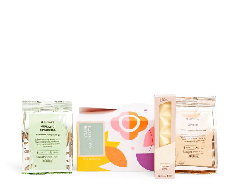 Любитель чая точно обрадуется такому подарку! Внутри — купаж черного чая «Соусеп» с летним ароматом фруктов и зеленый чай «Мелодия Прованса» с уютным звучанием согревающей корицы. Плитка белого шоколада на десерт станет прекрасным дополнением напитков.