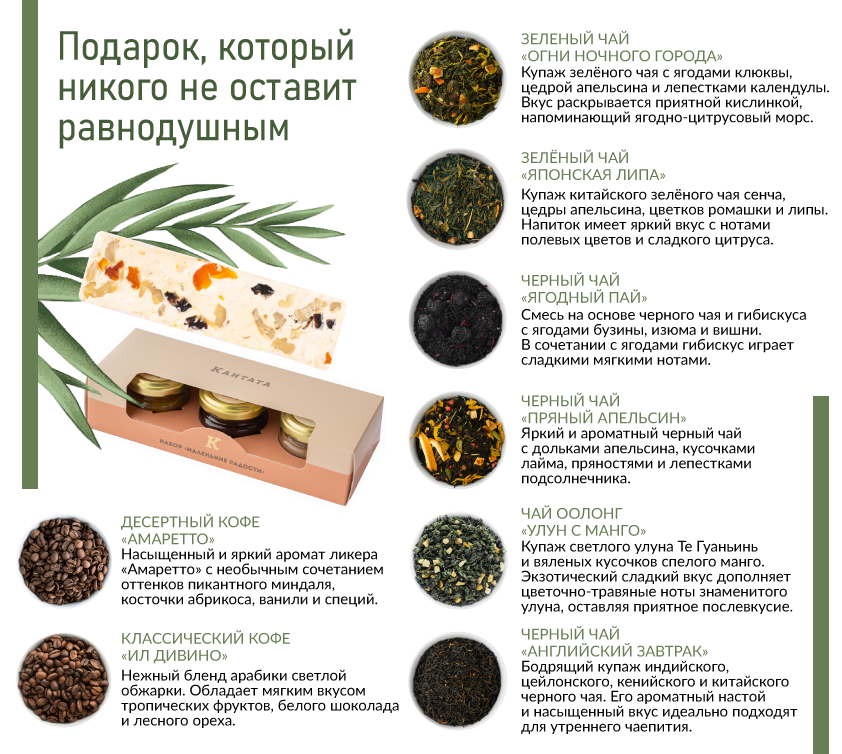 Отличный выбор для того, кто ценит вкус и качество! В подарке собраны шесть ароматных сортов чая и два сорта зернового кофе, дополненные десертами ручной работы.