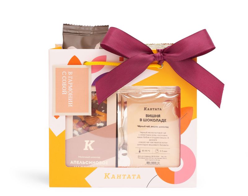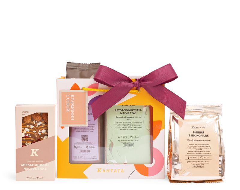 Стильная сумочка с окошком для яркого настроения! Внутри — авторский купаж «Магия трав» с легким цветочным мотивом, купаж черного чая «Вишня в шоколаде» с роскошным ягодным ароматом и десертный кофе «Сливочный ликер» с согревающим звучанием ириса. Плитка молочного шоколада с апельсином и миндалем прекрасно дополнит вкусы согревающих напитков.