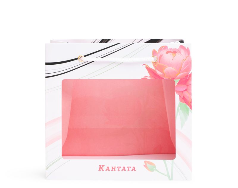 Стильная сумка с окошком для ваших подарков. Размер — 18x17x9см.