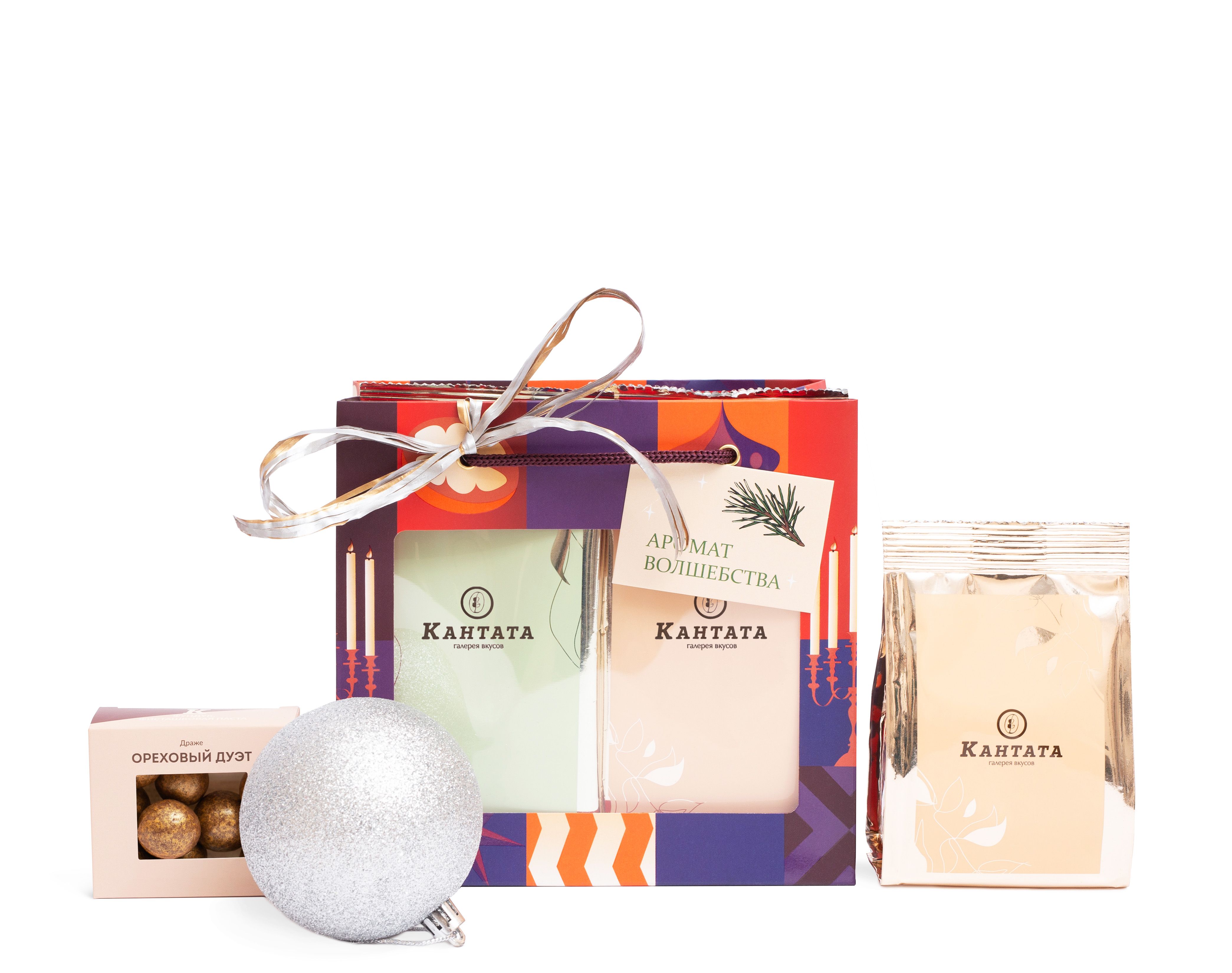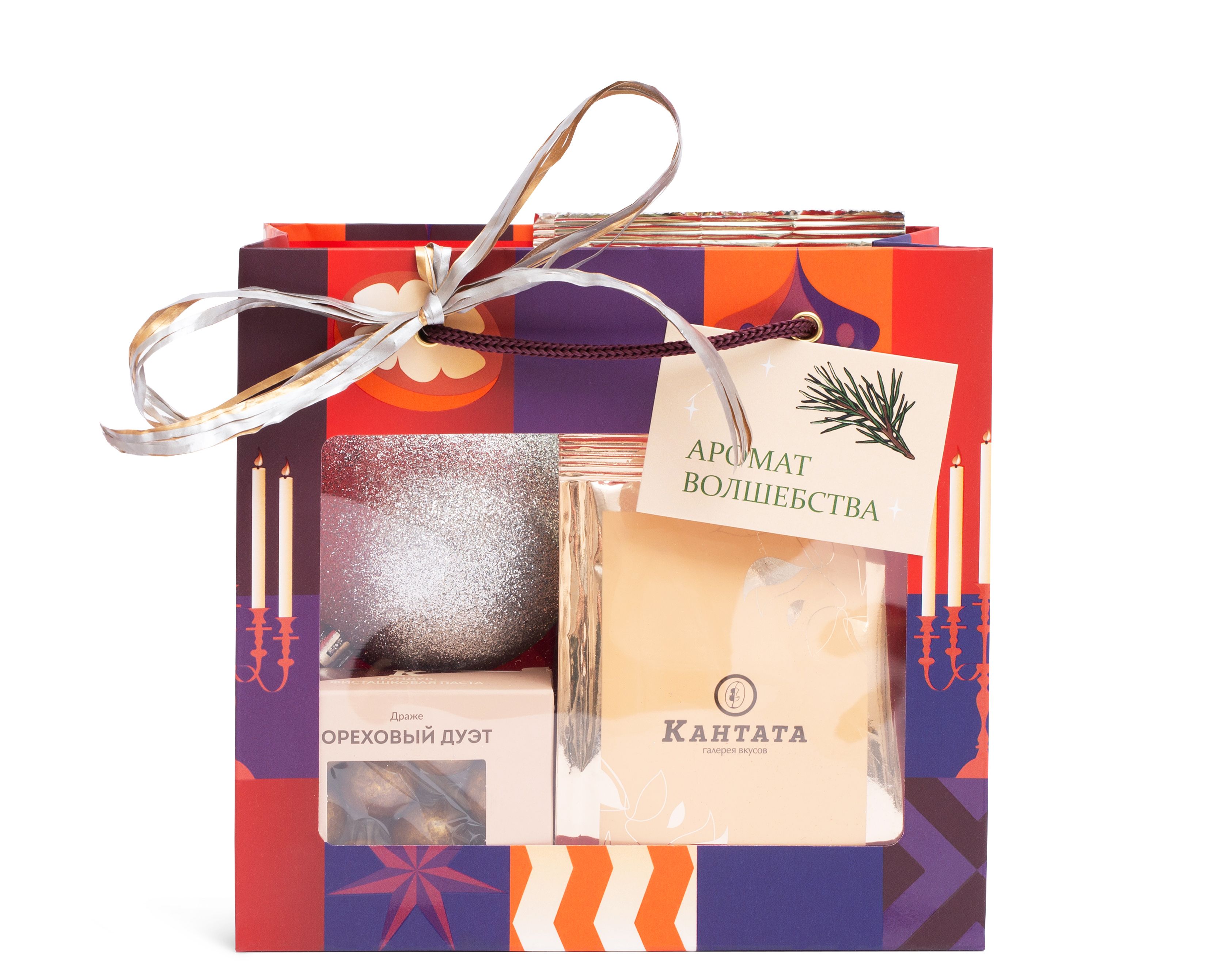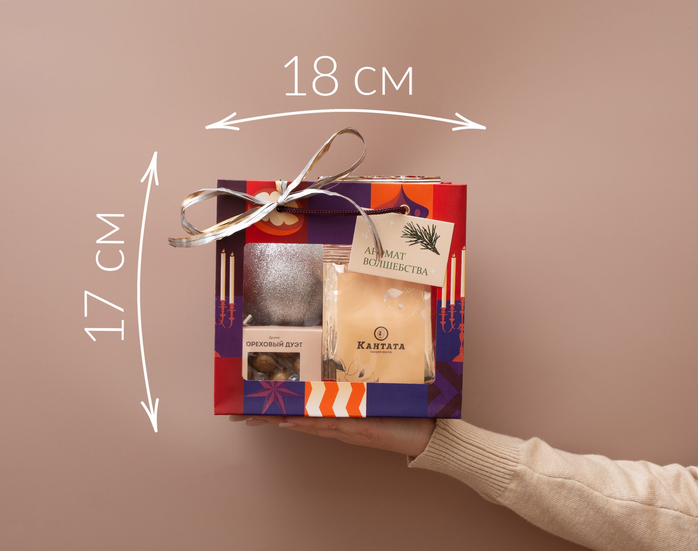 Пестрый подарок с окошком, за которым скрывается столько вкусного! Внутри набора — душистый купаж «Царский», созданный экспертами Кантаты, а также зеленый чай с освежающе-согревающим звучанием «Имбирный лимонад» и купаж черного чая с солнечными нотами «Пряный апельсин». На десерт — аппетитные драже ручной работы с орехами, которые дополнят чаепитие своим уютным сладким вкусом.
