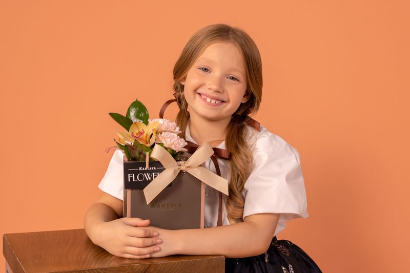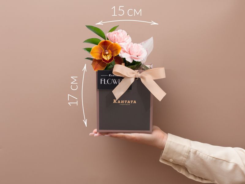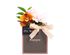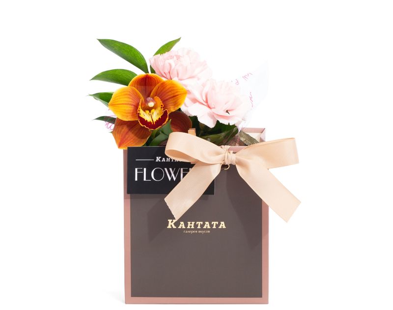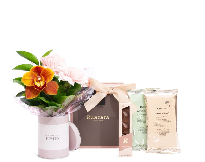 Пестрая орхидея, гвоздика и листочки рускуса украшают подарок, внутри которого — освежающий зеленый чай «Клубника-Киви», классический черный чай Таньян Конгоу с согревающими древесными нотами и плитка молочного шоколада на десерт. Набор дополняет стильная баночка для хранения, которая станет украшением интерьера кухни.