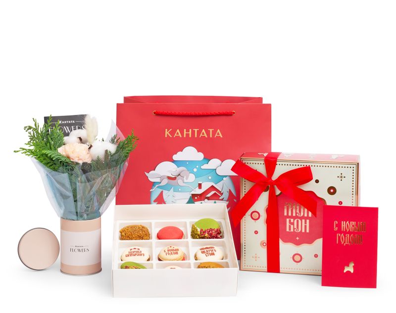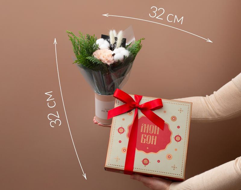 Набор объединяет в себе всё, что мы так любим зимой. Цветы создают атмосферу домашнего тепла, а десертная часть делает момент по-настоящему праздничным.