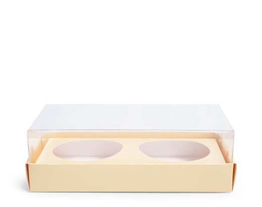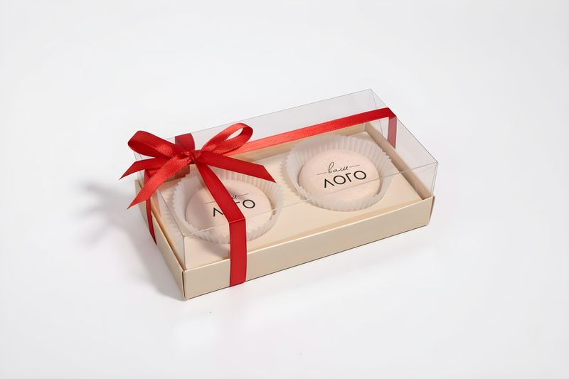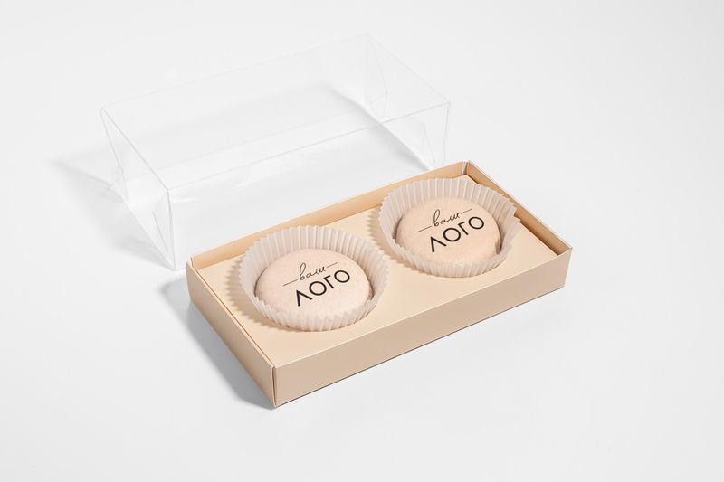 Два пирожных в ПВХ упаковке и бирка с вашим логотипом.