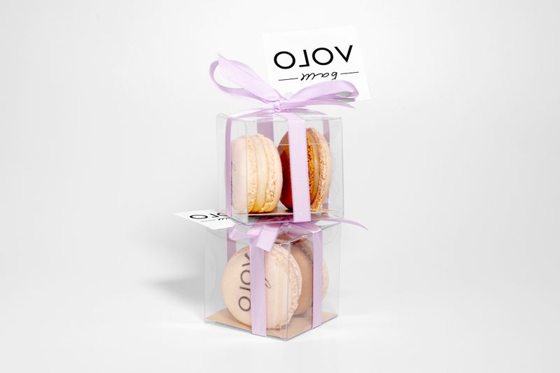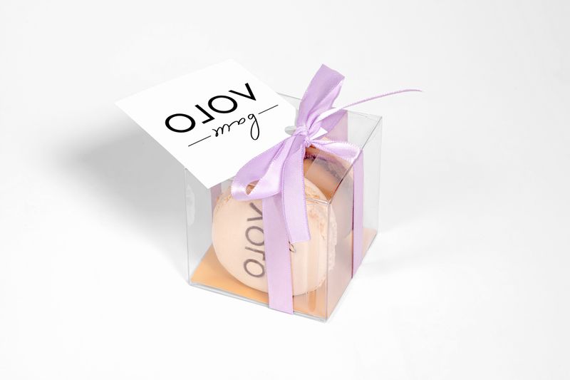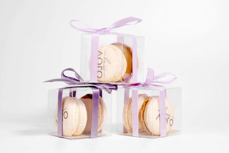 Набор из двух пирожных макарон с логотипами в прозрачной бонбоньерке – отличный выбор для подарка сотрудникам на корпоративе, или комплиментам гостям на свадьбе.