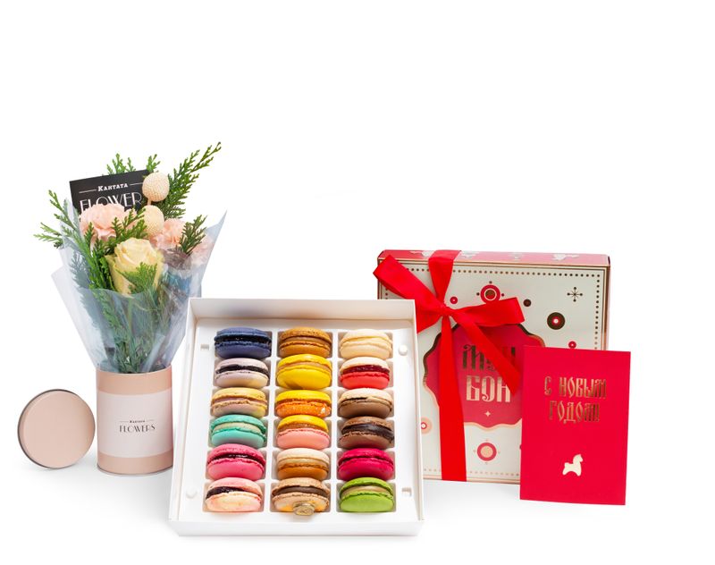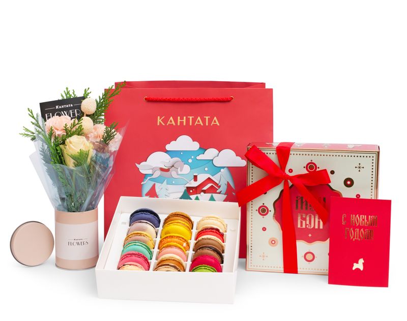 Для тех, кто хочет подарить одновременно и атмосферу праздника, и настоящее гастрономическое удовольствие. Живые зимние цветы наполняют пространство теплом и ощущением предстоящего чуда, а большое ассорти пирожных превращает подарок в яркое сладкое впечатление.