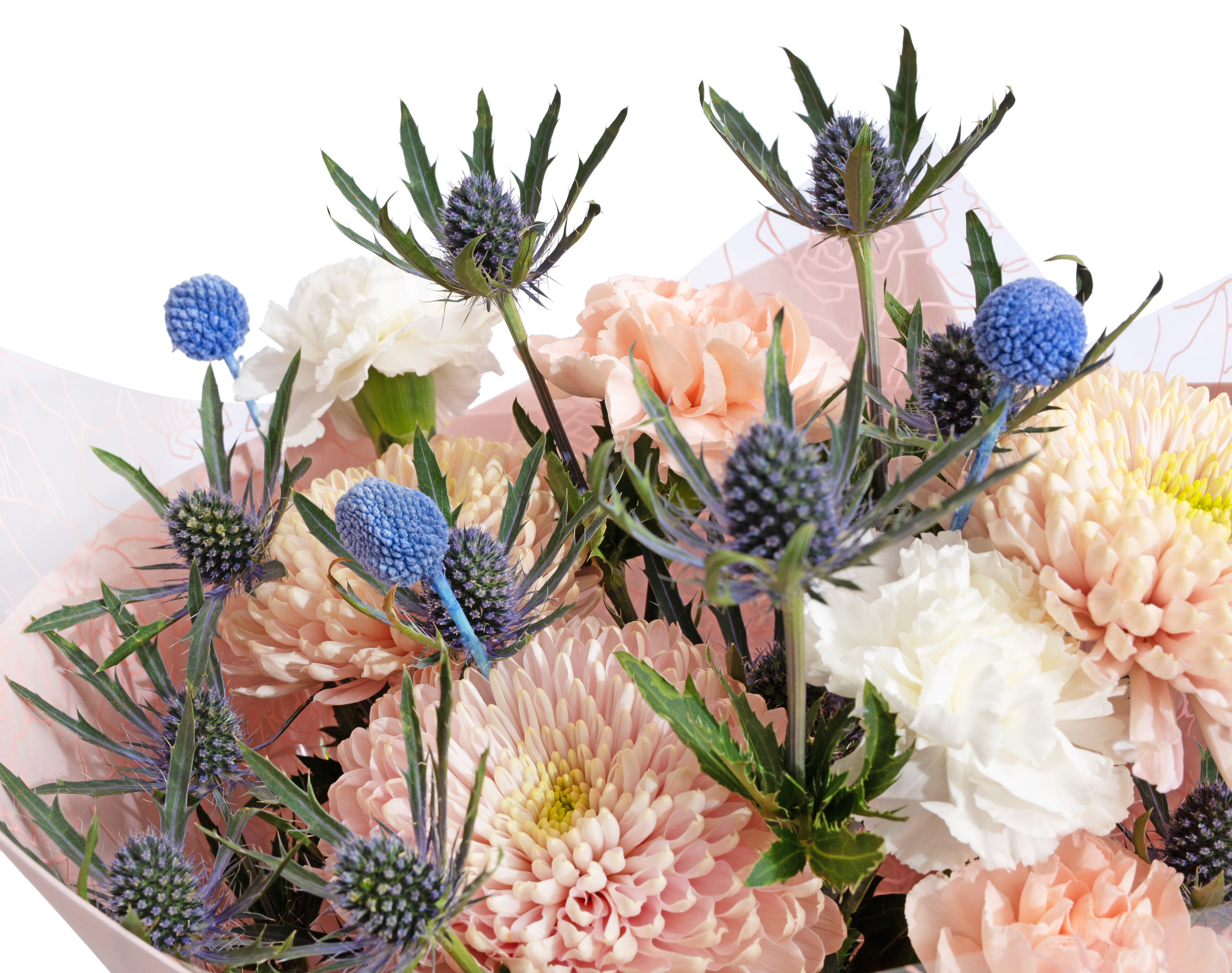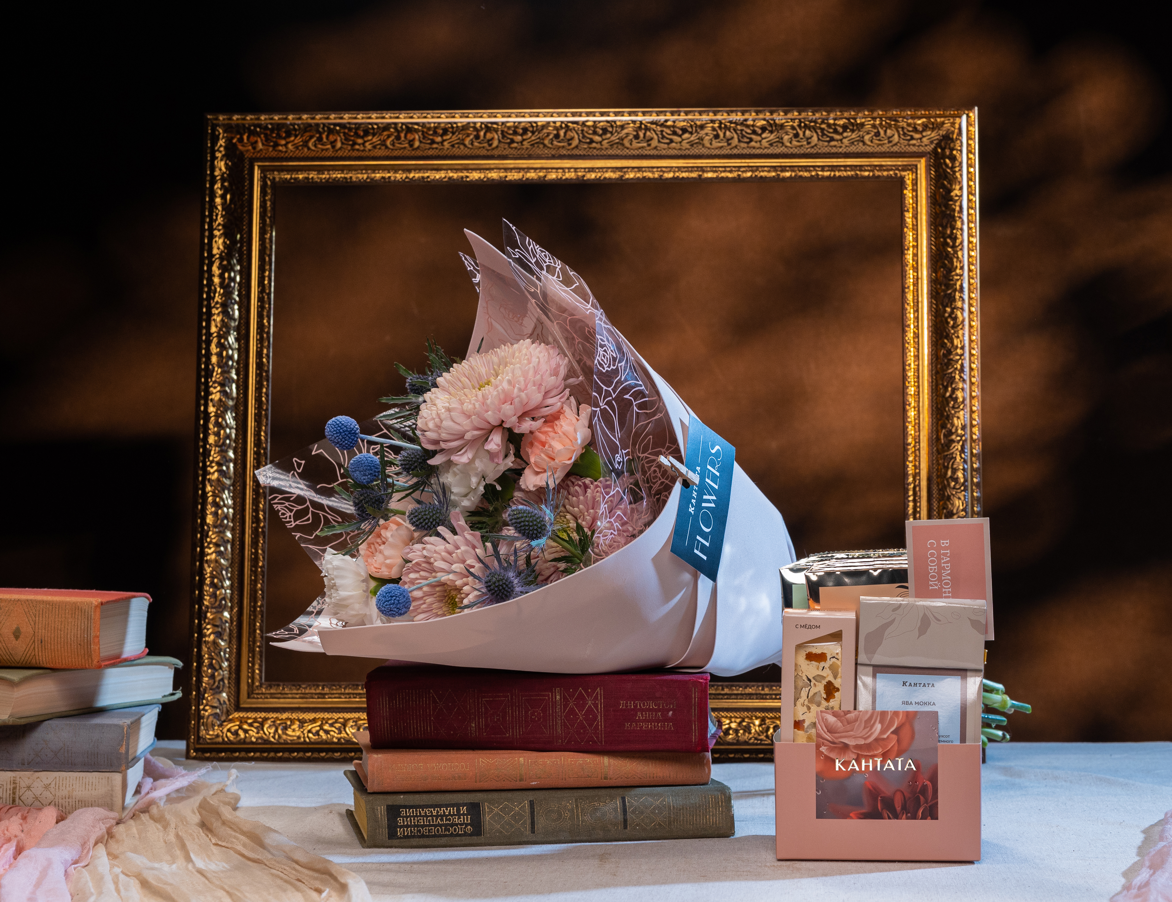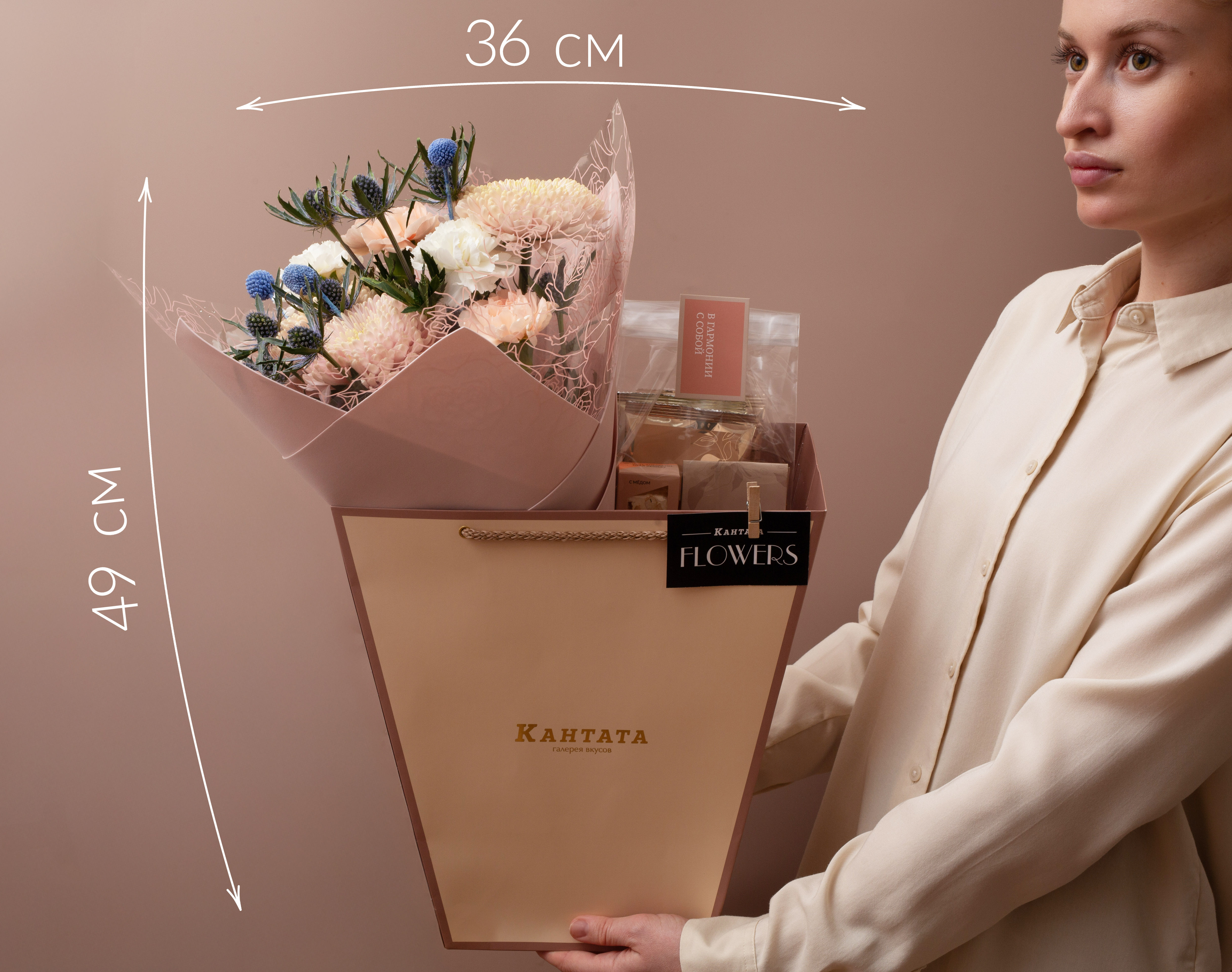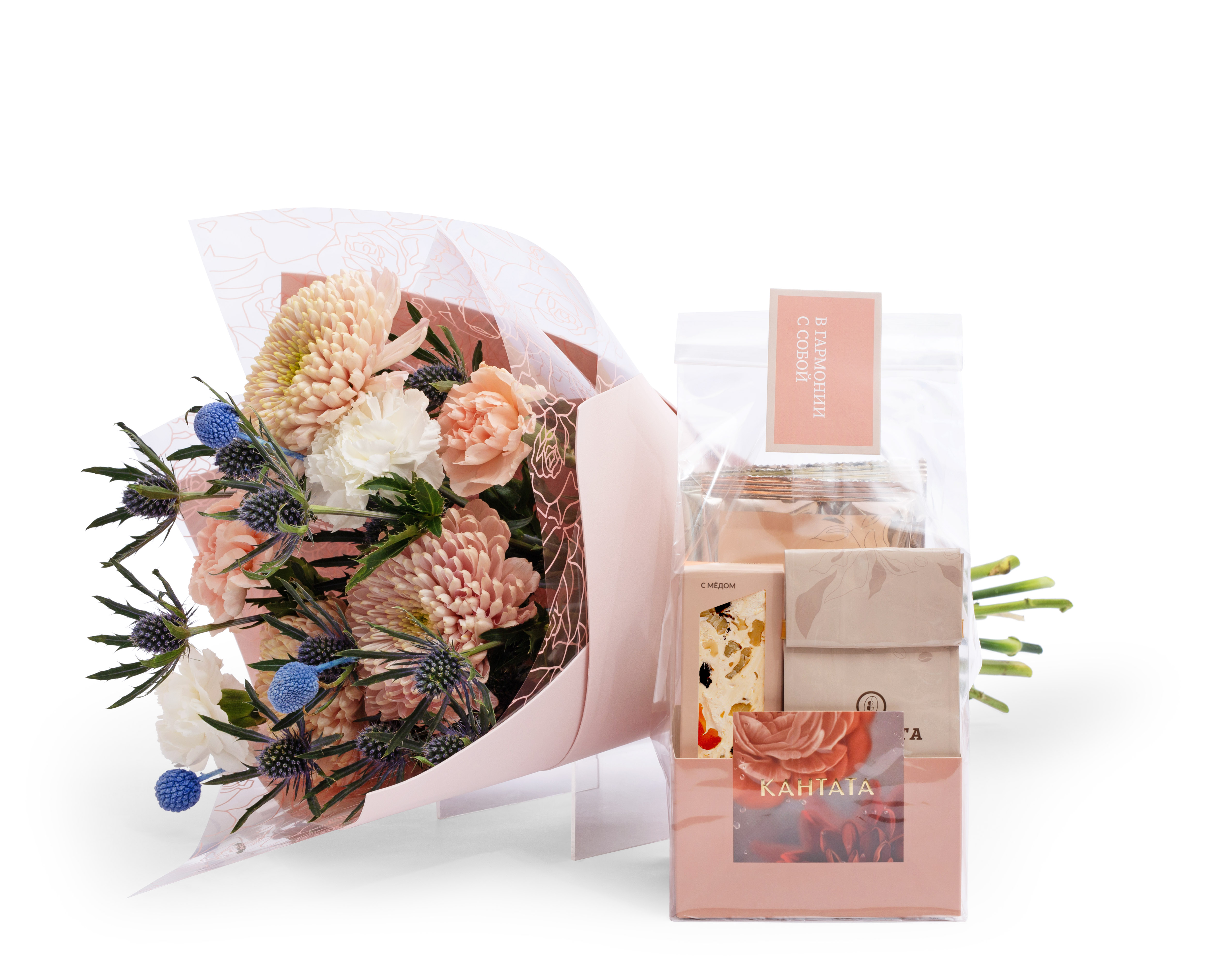 Этот подарок звучит как тихая музыка осени: густые краски хризантем, эринигиума и гвоздик встречаются с мягкими оттенками йогуртового фоамирана и вкусовыми нотами кофе, нуги и чёрного чая. Набор в эффектной сумке создаёт настроение тёплой благодарности и заботы.