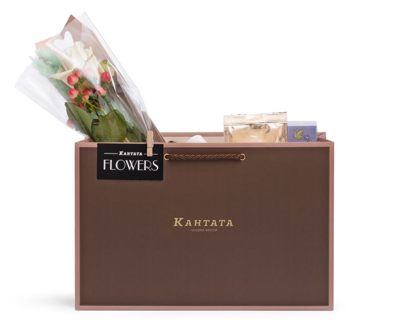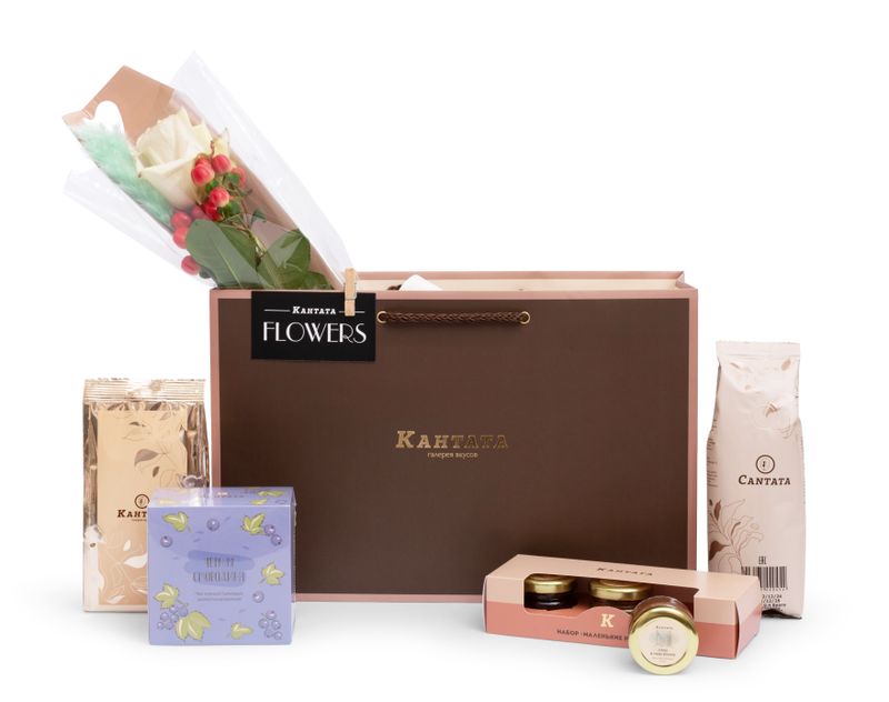 Элегантный набор в горизонтальной сумке сочетает изысканные сладости и чай с мягкими флористическими акцентами.