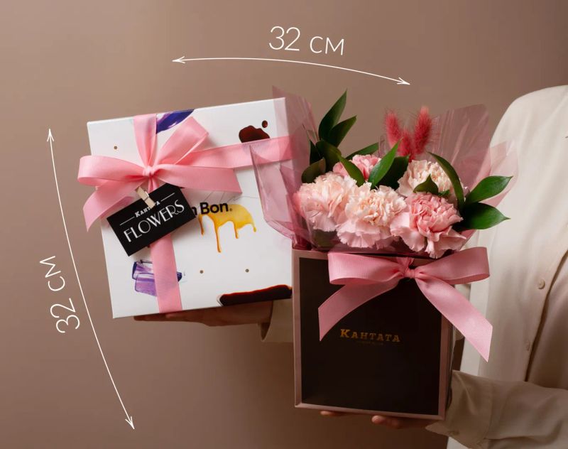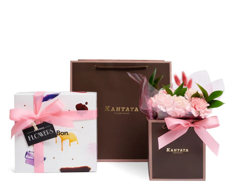 Элегантный подарочный набор, в котором вкус и эмоции звучат в унисон. Девять изысканных монбонов с выразительными начинками дополнены живой цветочной композицией и оформлены в фирменную упаковку Кантаты. Продуманный, теплый и по-настоящему красивый способ сказать о главном — без лишних слов.