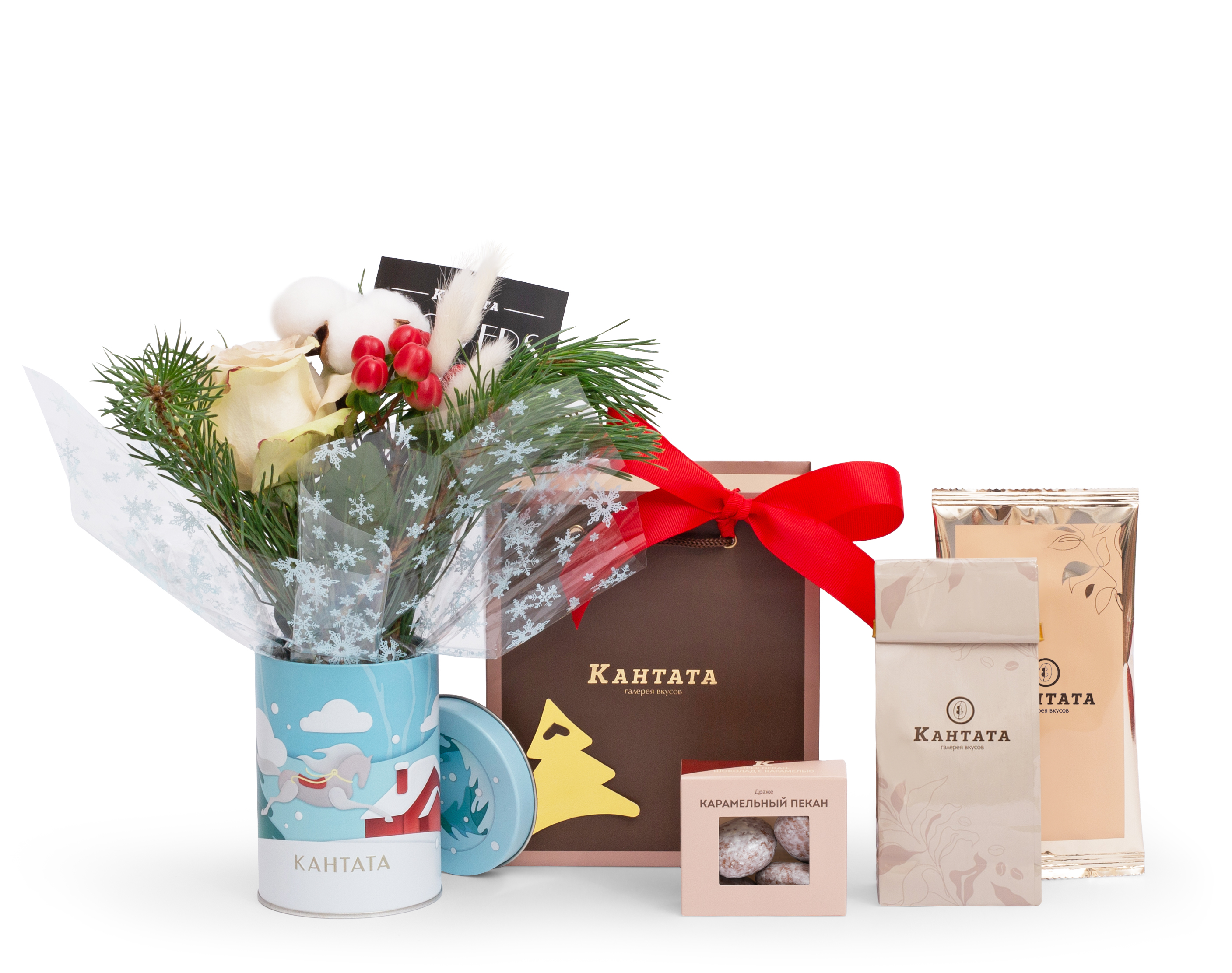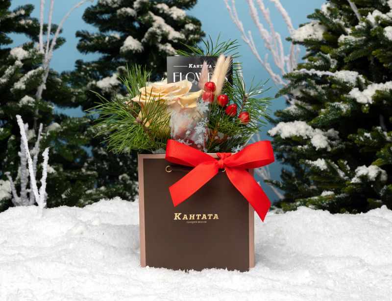 Элегантное сочетание ароматного кофе, вкусного чая, веточек сосны и живых роз создает атмосферу зимнего уюта и праздничного вдохновения.