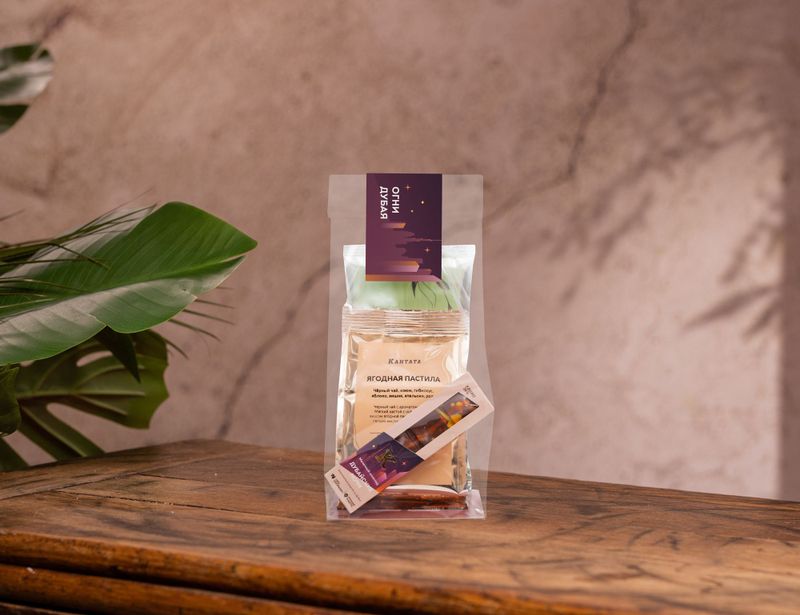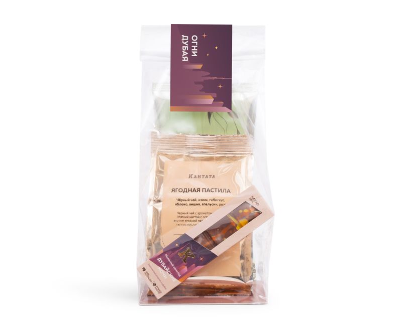 Роскошный подарок для того, кто хочет окунуться в жаркую восточную сказку! Лейтмотивом этого подарка стал легендарный шоколад по рецепту из Дубая – шокобар «Дубайские ночи» с обволакивающей фисташковой начинкой и хрустящим тестом «катаифи» под слоем ароматного молочного шоколада. К десерту – знойная пара напитков: насыщенный черный чай «Ягодная пастила» и «Аромат путешествий» – освежающий зеленый чай с искрящимся ароматом груши и бергамота.