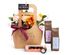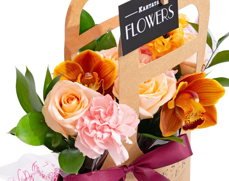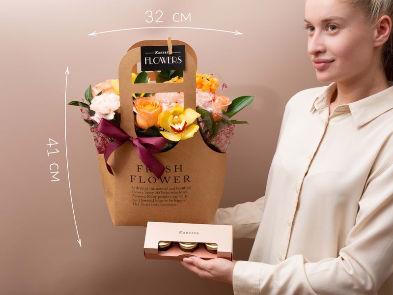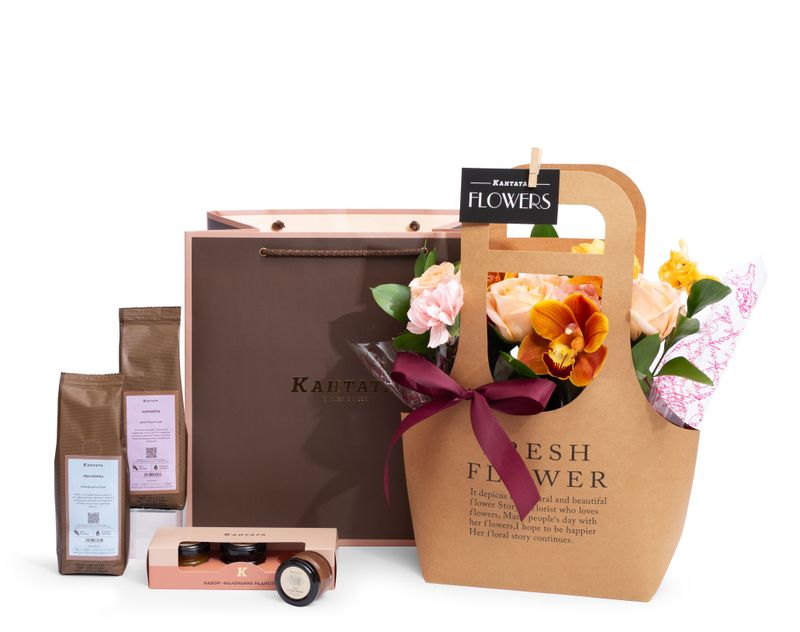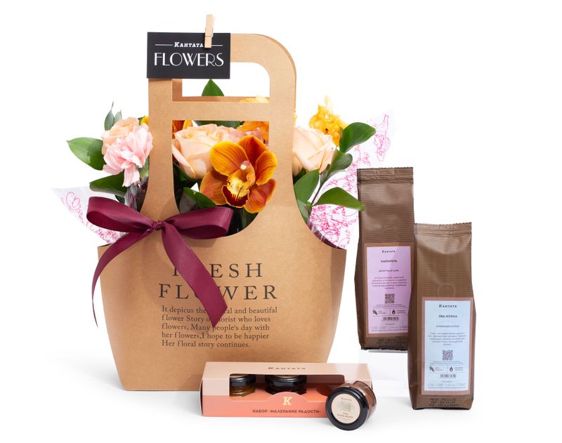 Изящная крафтовая сумочка, внутри которой — настоящий пожар из орхидей, гвоздик и роз! Цветочную композицию мы дополнили двумя бодрящими сортами кофе, классическим и десертным, а к напиткам добавили набор из трех баночек с аппетитными сладостями ручной работы.