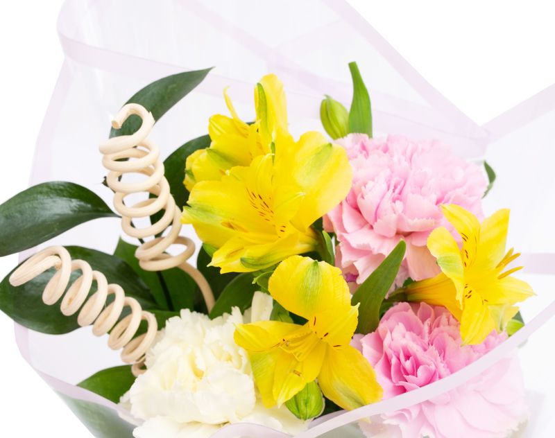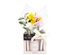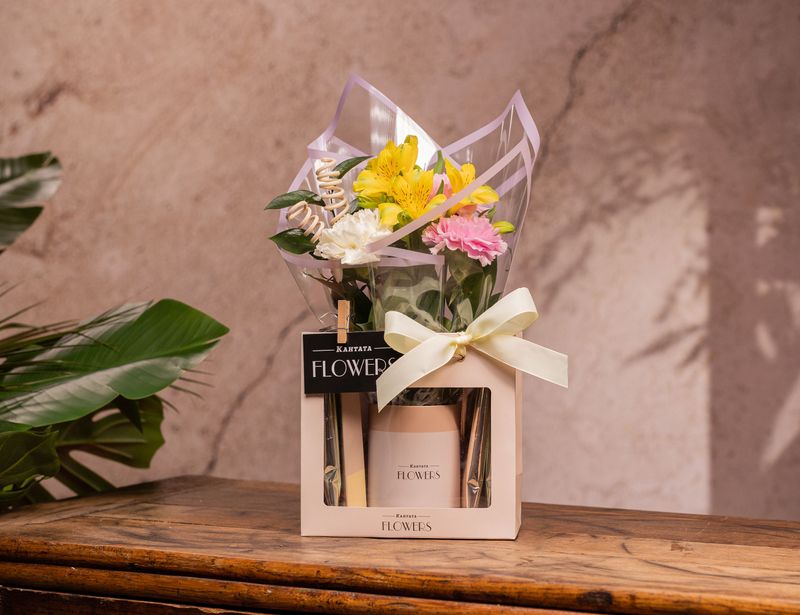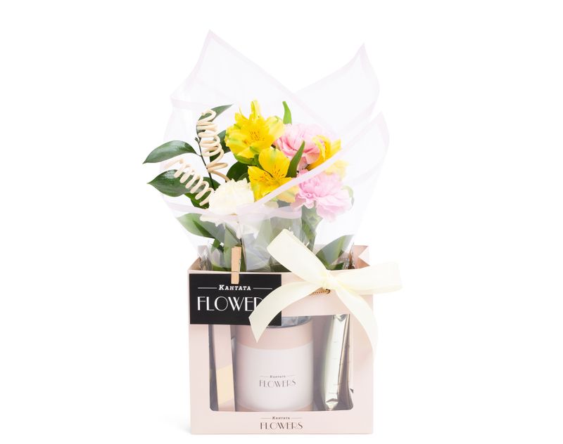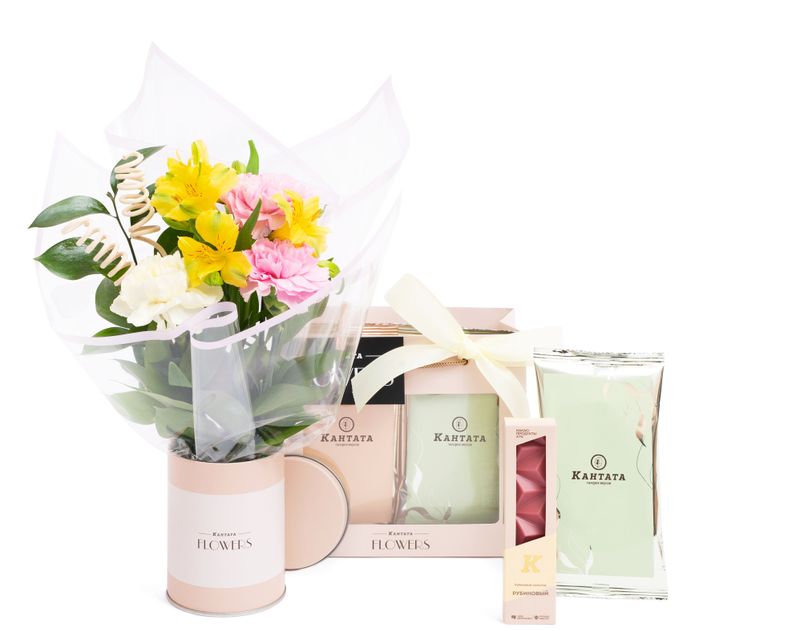 Изящная цветочная композиция, вдохновленная первым весенним солнышком! Рядом с живыми цветами — три душистых купажа, аппетитный десерт ручной работы и стильная баночка для кухни.