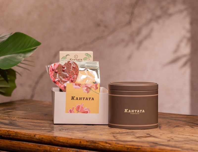 Тематический подарок, внутри которого собран душистый чай с десертом ручной работы, а к ним добавлены аксессуары — для хранения и для чаепитий.