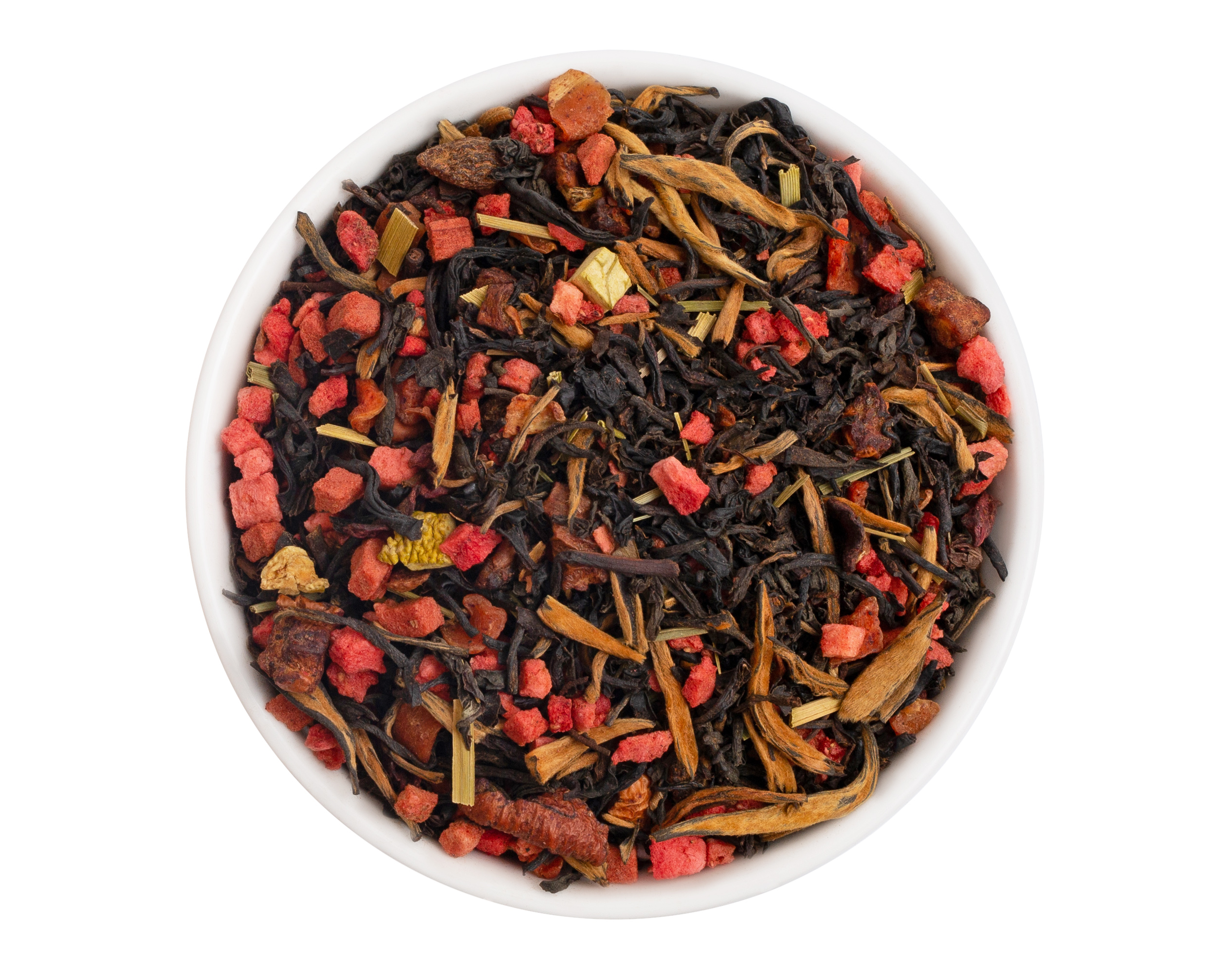 «Праздничное чаепитие» — это яркий купаж, в котором медовая сладость китайского чая сорта Дяньхун встречается с сочными акцентами клубники, смородины, ежевики и грейпфрута.