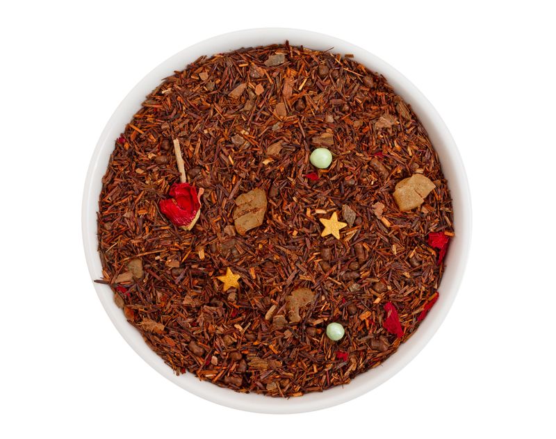 Особое очарование купажу придают красные лепестки граната и праздничный кондитерский декор — они делают его по-настоящему зимним, подарочным и «сказочным». Это идеальный чай для вечерних семейных посиделок, для прогулок с термосом или для уютных домашних ритуалов, когда хочется тепла и спокойствия.