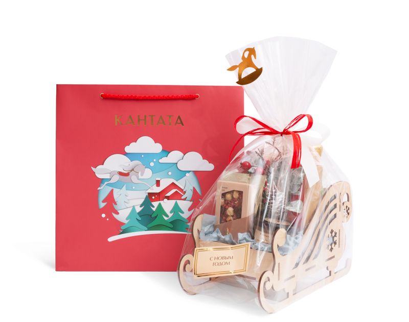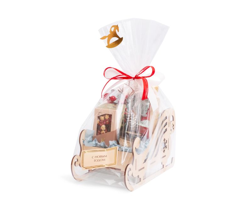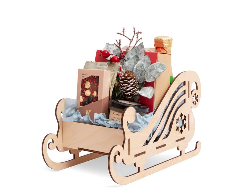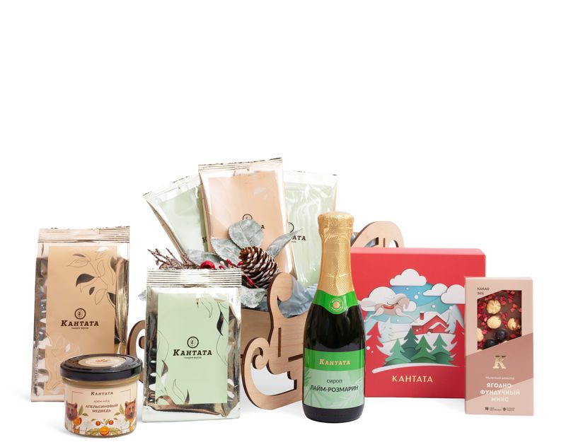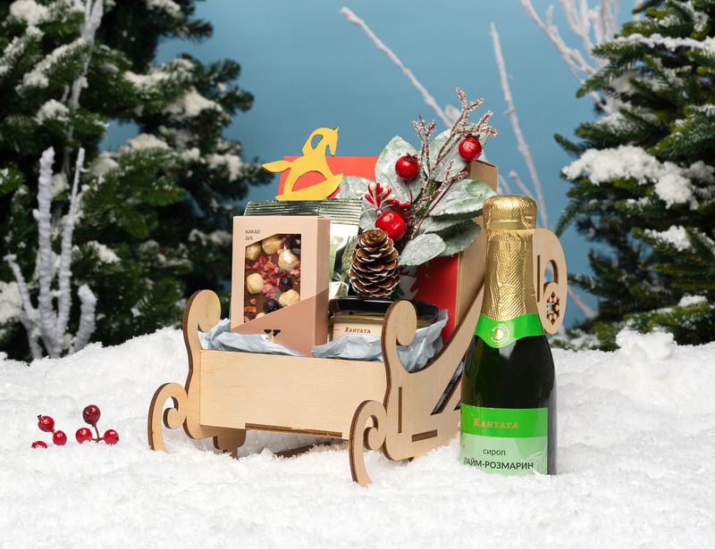 Праздничный набор, в котором каждая деталь дышит уютом и теплом зимних вечеров. В деревянных санях — ароматный чай, нежный крем-мёд и молочный шоколад с ягодами, дополненные ярким сиропом с нотами лайма и розмарина. Декоративная веточка с ягодами завершает композицию, превращая подарок в настоящее украшение новогоднего стола.