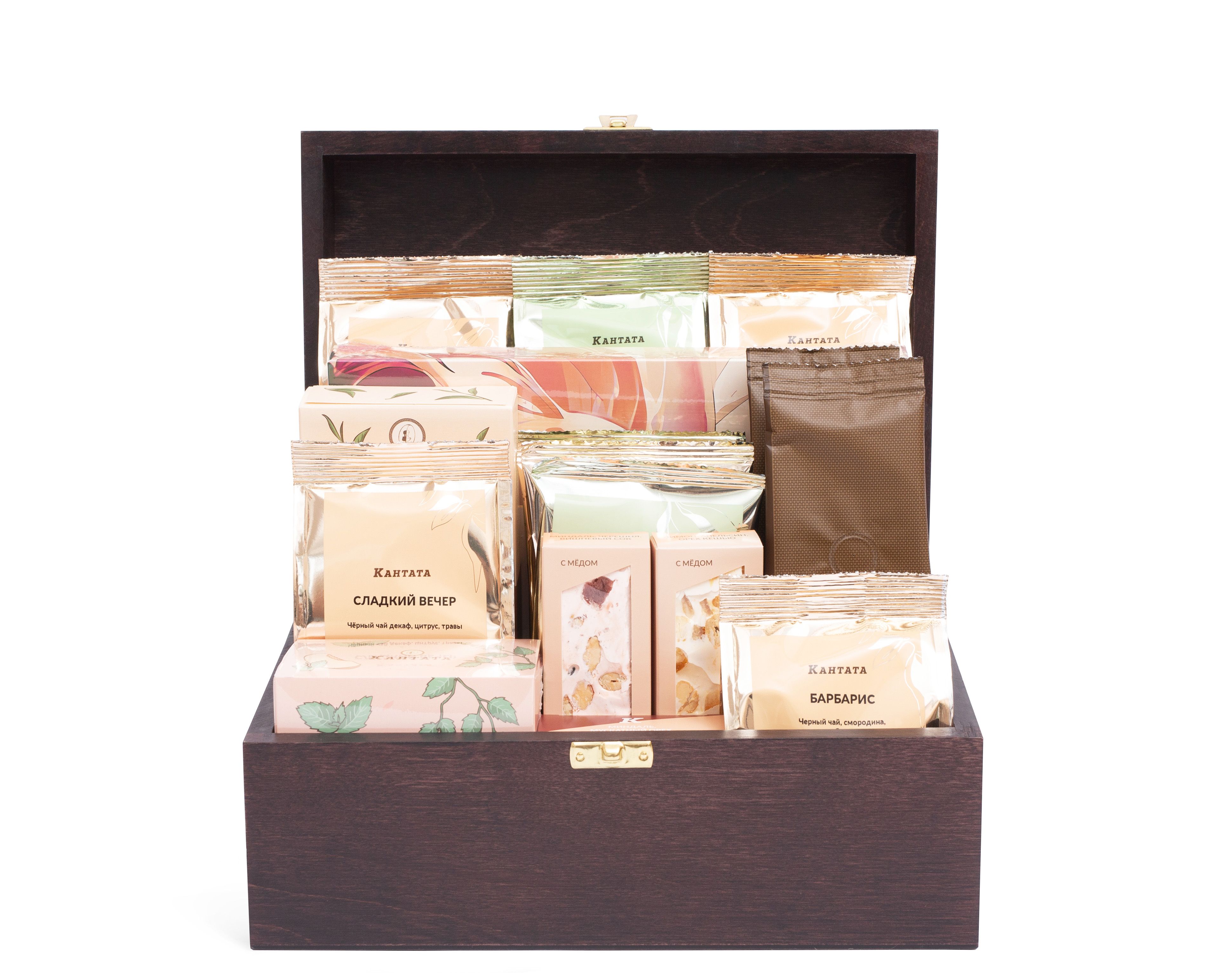 Роскошный подарок для ценителя лучших вкусов! Внутри — более десяти сортов чая и кофе, среди которых найдутся как десертные купажи, так и знаменитая классика. Вкусы напитков ответят под любой запрос: пряные и нежные, ягодные и фруктовые, согревающие и освежающие. Чтобы чаепития проходили с максимальным комфортом, в подарок мы вложили удобные фильтр-пакеты для заваривания. Помимо двух видов воздушной нуги и ореховых драже в шкатулку мы добавили набор десертов «Сладкие мелодии»: шесть уникальных вкусов шоколада ждут, чтобы разнообразить чаепитие или кофе-брейк!