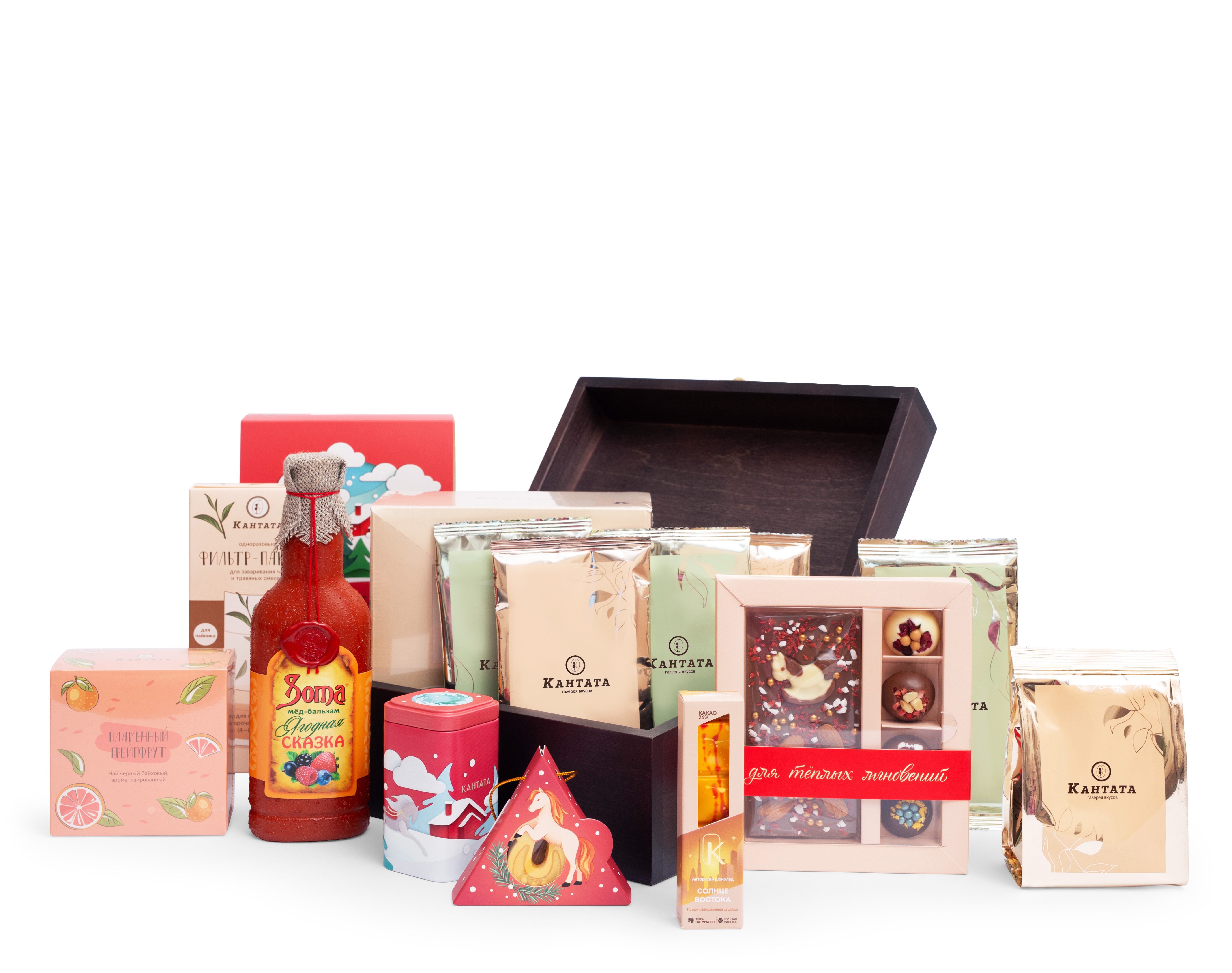 Щедрый набор для по-настоящему праздничных мгновений. Внутри — лучшие купажи Кантаты, стильная банка, сладкие акценты и натуральный мёд-бальзам, создающие ощущение тепла и уюта. Такой подарок объединяет всё, за что мы любим зиму: аромат цитрусов, вкус шоколада и ожидание маленького чуда.