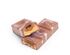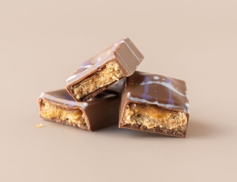 Особое внимание уделено начинке. Она состоит из двух слоев, каждый из которых привносит что-то особенное и незабываемое. Нижний слой представляет собой гармоничное сочетание миндальной пасты собственного производства, теста катаифи и обволакивающего белого шоколада. Верхний слой радует вкусовые рецепторы текучей карамелью с легкими нотками инжира. Во время дегустации сливочная карамель мягко вплетается своими сладкими нотками и кремовой текстурой в хрустящий слой начинки.