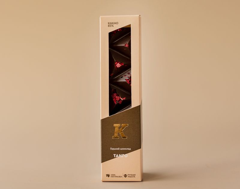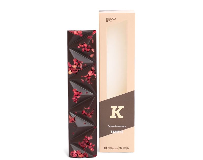 Классический горький шоколад с содержанием какао-продуктов не менее 85%. Выполнен с добавлением сублимированных ягод малины.
