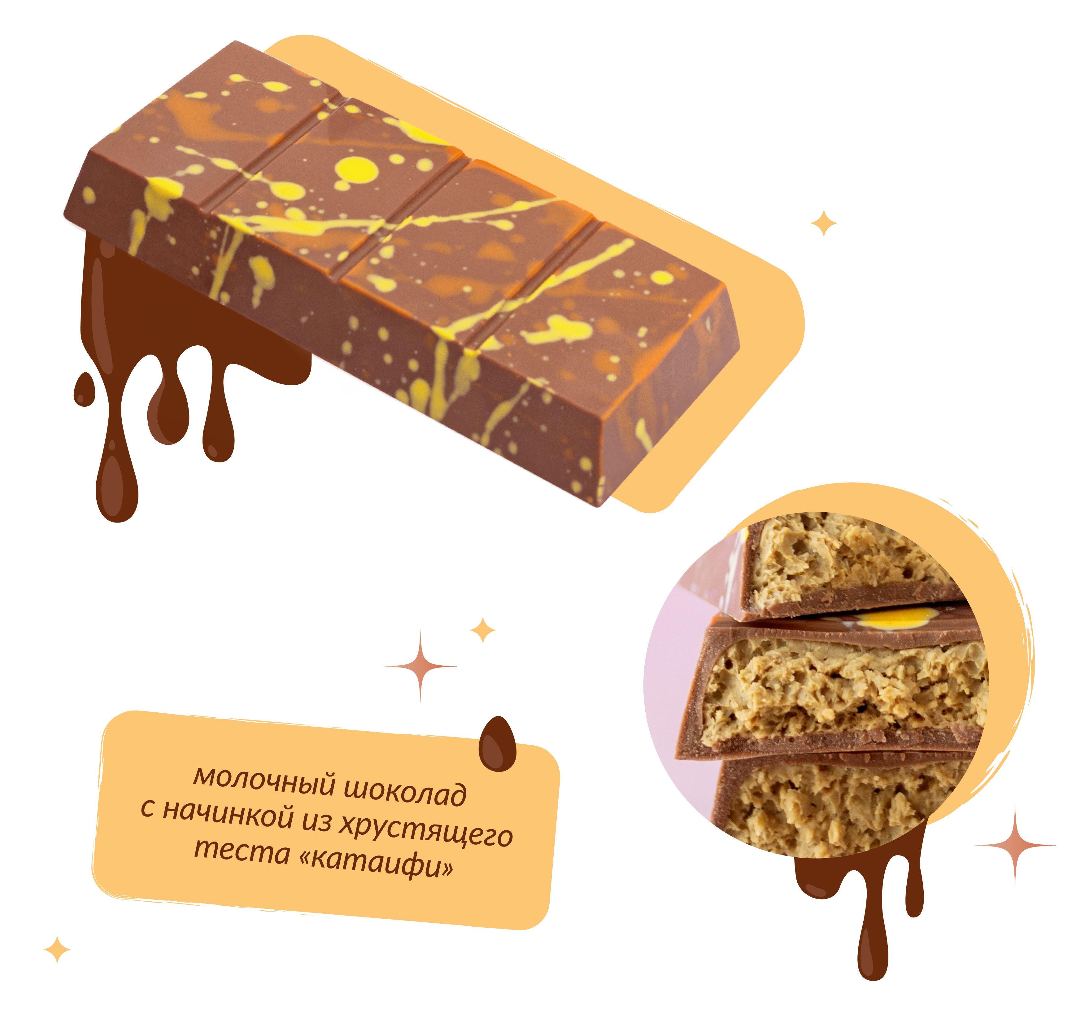 Вдохновившись роскошью и кулинарными изысками Дубая, шоколадная фабрика создала свое прочтение дубайского шоколада, которое не только сохранило узнаваемые черты восточного десерта, но и привнесло мелодию творчества.