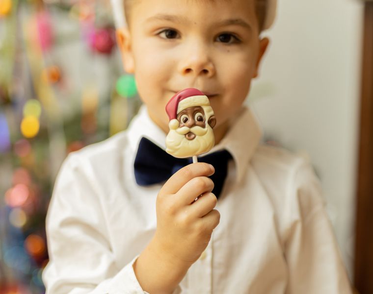 Фигурку украшают белый и темный шоколад. Десерт умеренно-сладкий, с долгим сливочным послевкусием. Десерт станет отличным подарком для маленьких сладкоежек, добавит яркий новогодний акцент в подарки для друзей и близких. А также прекрасно дополнит чашечку кофе или чая морозным зимним днем.