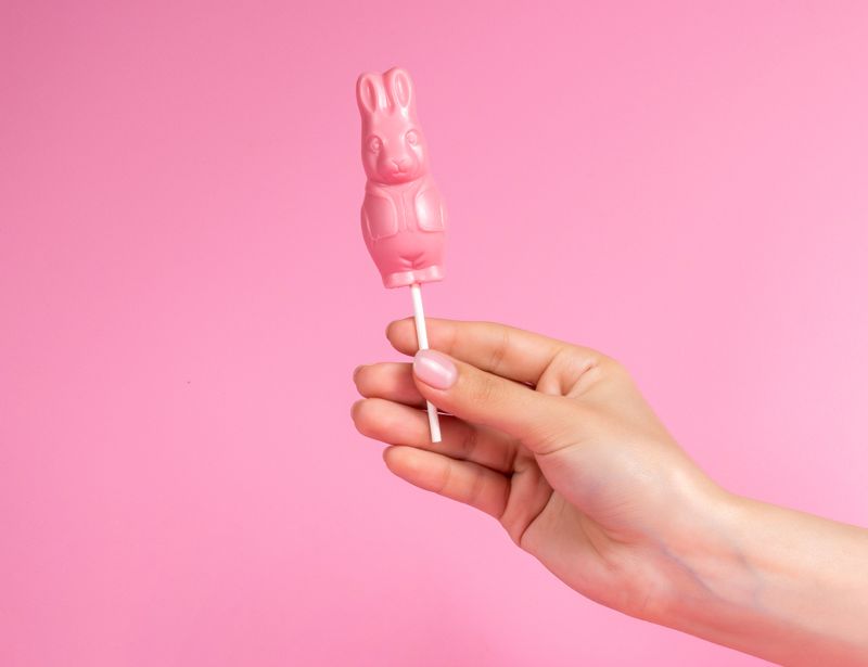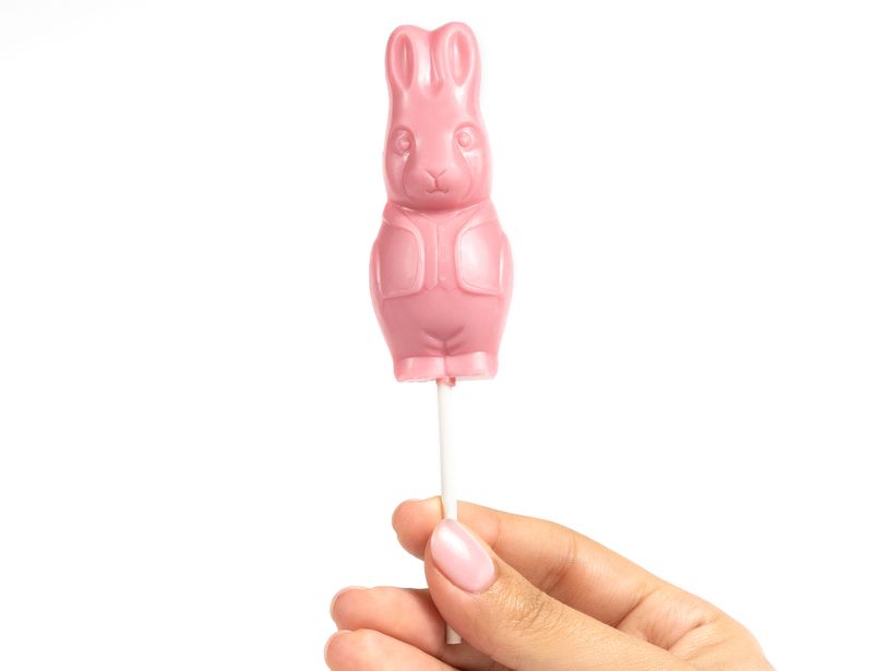 Забавный братец кролик изготовлен из белого шоколада с клубникой. У этого десерта задорное, сладкое, сливочно-ягодное настроение.