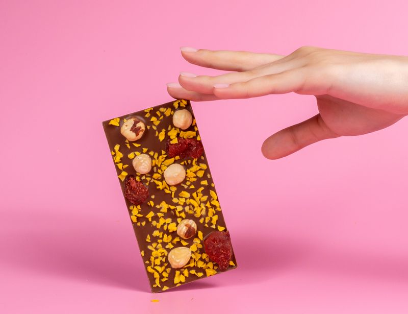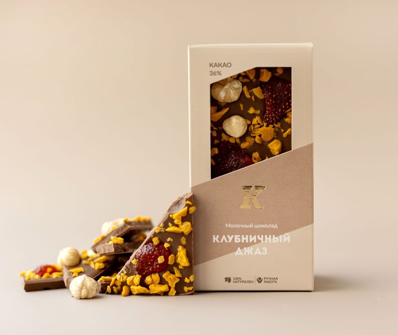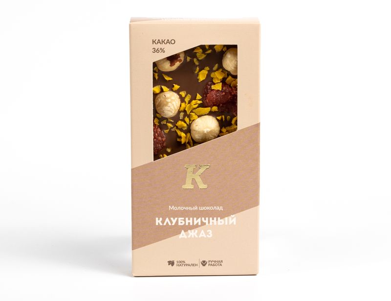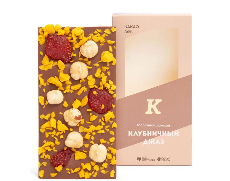 Собственный купаж молочного шоколада подарит волшебное наслаждение от мягкого вкуса и нежного аромата какао. Каждую плитку кондитеры трепетно украшают отборным фундуком, который придает десерту особую пикантность. Выразительные акценты в декоре раставляют цукат клубники и сладковатый кранч «Манго».