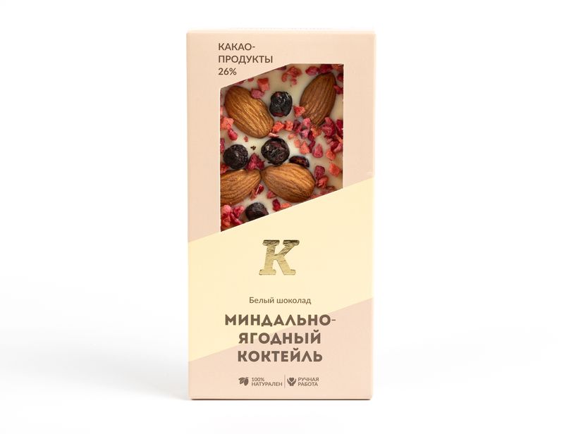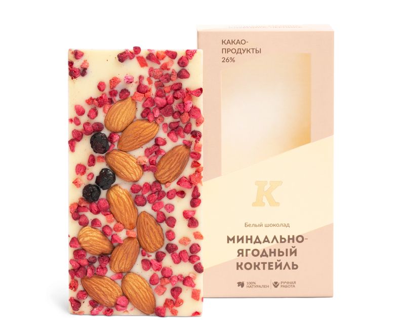 Обволакивающий белый шоколад с оттенками топленых сливок дополнен отборным миндалем, сублимированной клубникой, малиной и черникой.