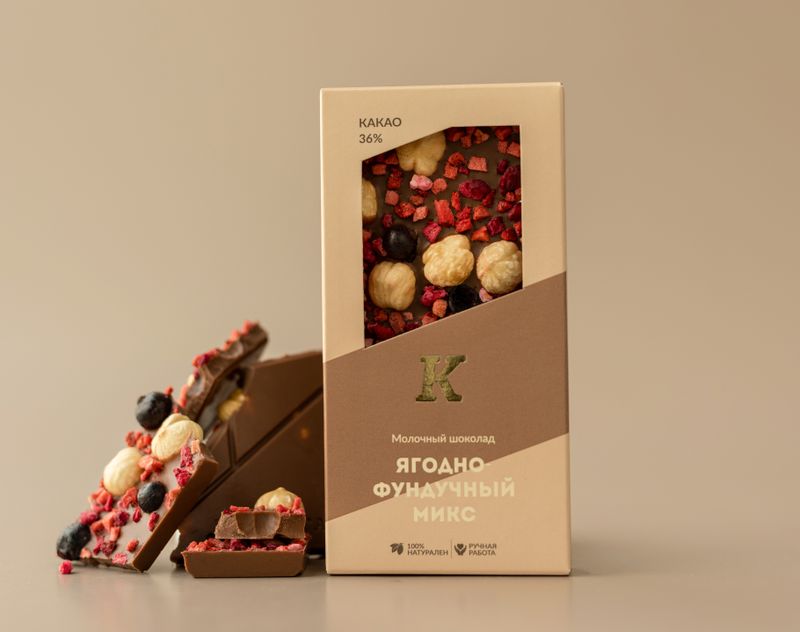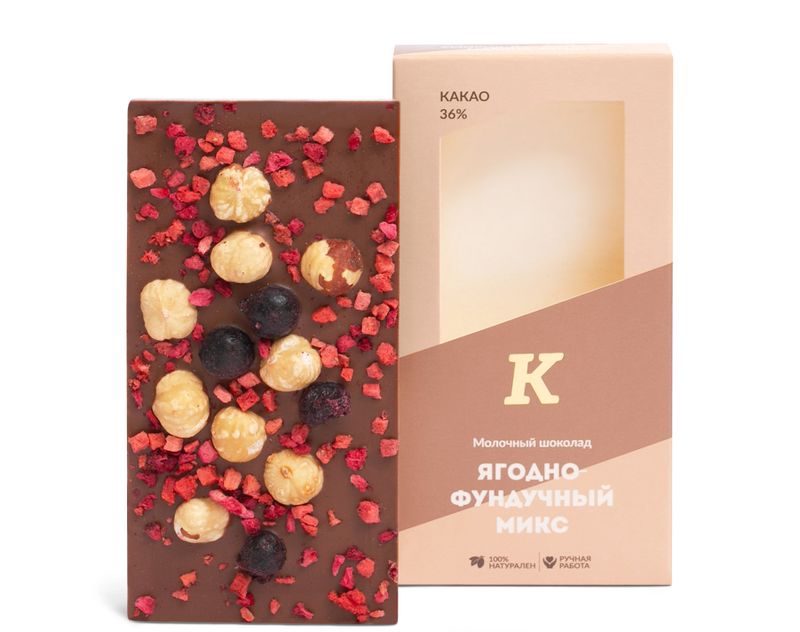 Состав: молочный шоколад (тростниковый сахар, какао-масло, какао тертое, сухое цельное молоко, эмульгатор: соевый лецитин; натуральный ароматизатор: ваниль), фундук жареный, сублимированные ягоды: клубника, малина, черная смородина. Содержание какао-продуктов — не менее 37%. Содержит молоко, сою. Может содержать следы продуктов, вызывающих аллергию.