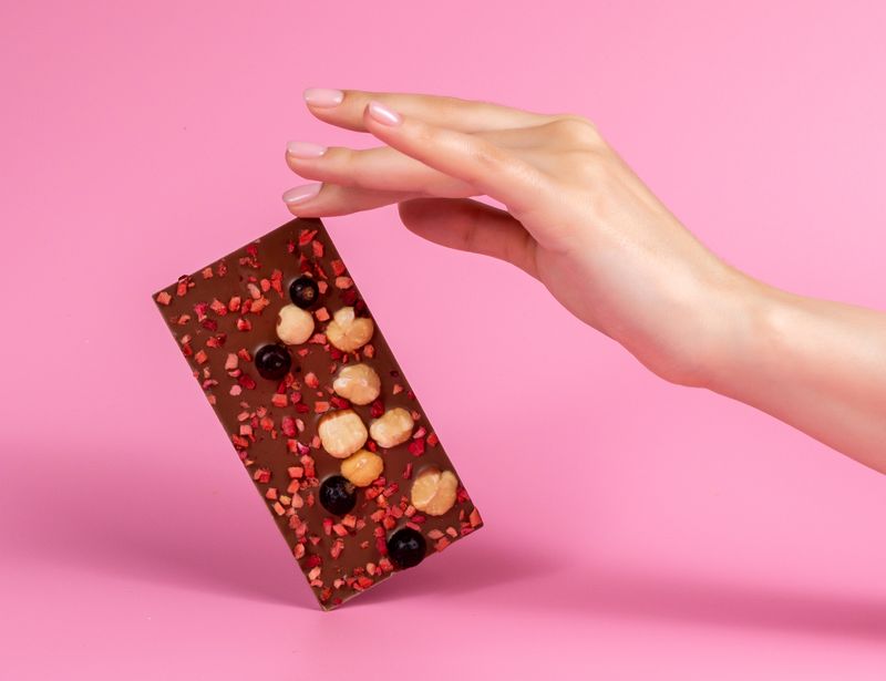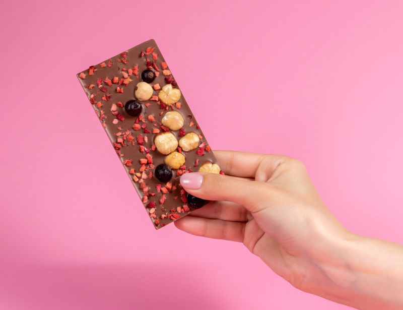 Для изготовления десерта «Ягодно-фундучный микс» используют ягоды, которые прошли особую вакуумную сушку. Такая процедура помогла им сохранить не только свою форму и вкус, но и полезные свойства. А значит, каждый кусочек этого шоколада наполнен витаминами.