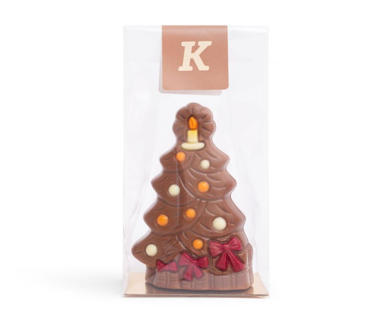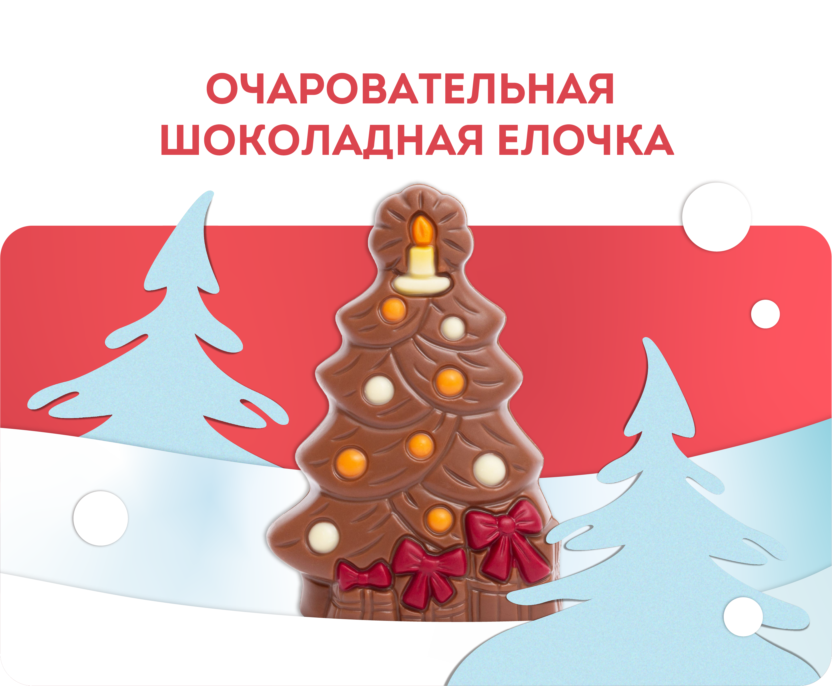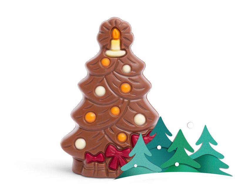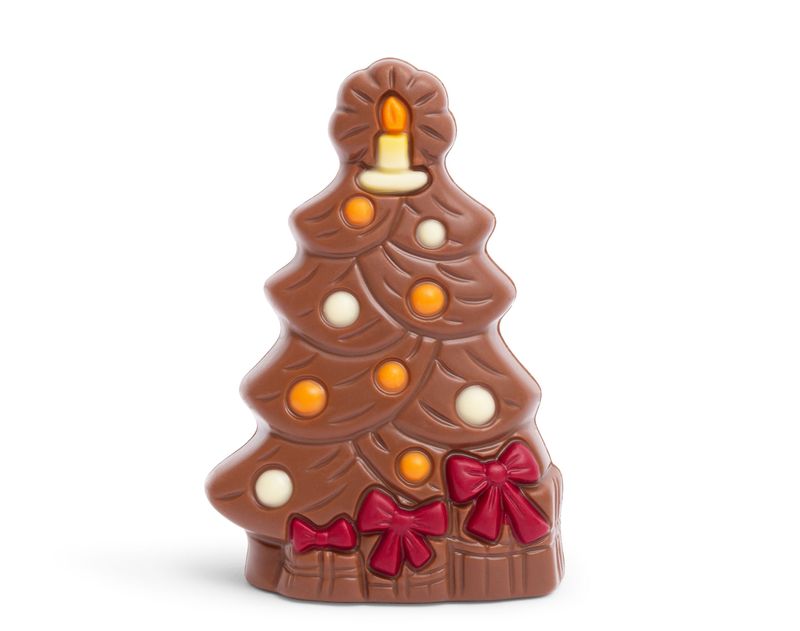 Корпус выполнен из гладкого молочного шоколада с мягким матовым блеском, будто покрытым лёгким инеем. Белые и апельсиновые элементы из шоколада напоминают яркие игрушки и гирлянды, а макушку венчает свеча, излучающая тепло и уют.