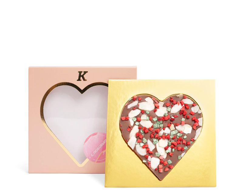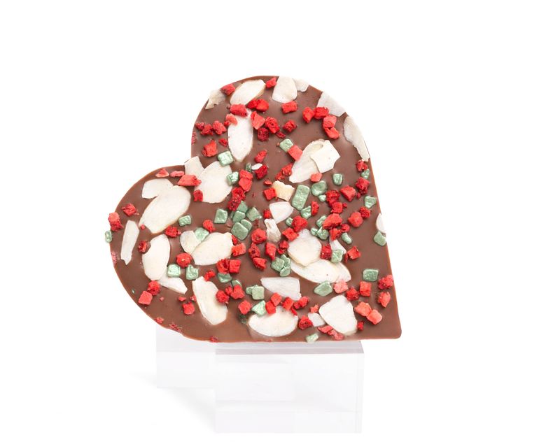 Плитка из молочного шоколада в форме сердца украшена очаровательным декором из сублимированной клубники и сияющей шоколадной крошки. Легкость десерту добавляют лепестки миндаля. Настоящий символ вашей любви, которым хочется вдохновляться и наслаждаться.