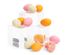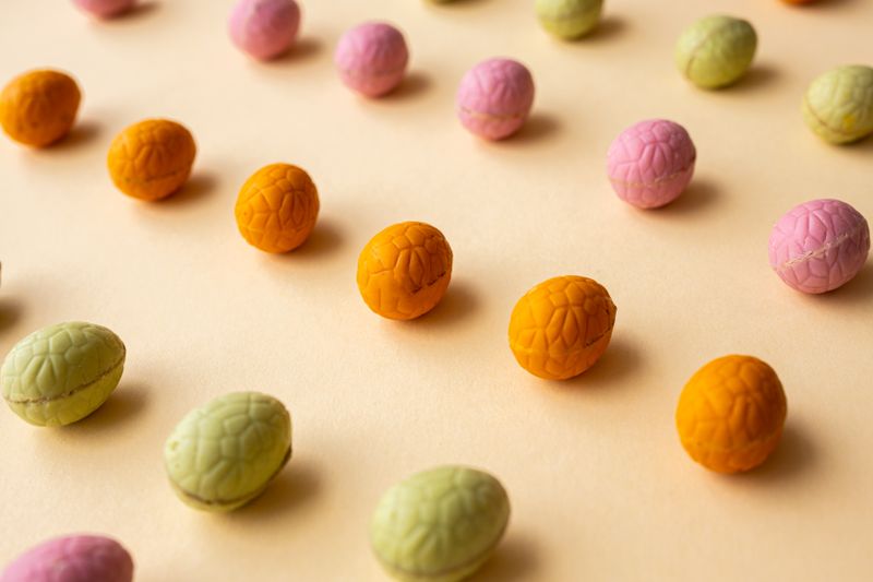 Шоколадные яйца розового цвета изготовлены из белого шоколада и перетертого миндаля и имеют клубнично-вишневый вкус. Оранжевый цвет шоколадного десерта пленяет нежными нотками апельсина и тающей текстурой белого шоколада и миндаля. Зеленые яйца заполнены шоколадно-фисташковой начинкой с шариками воздушного риса и церемониальным японским зеленым чаем «Матча». Выбирайте разные цвета десерта, чтобы добавить своему настроению радужных оттенков!