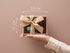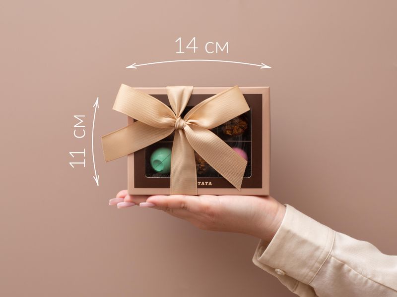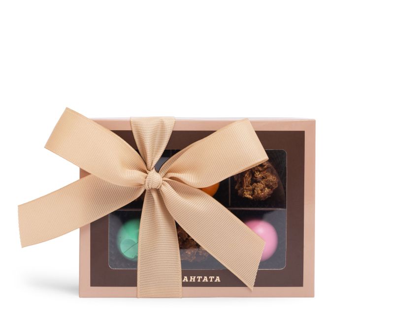 Изящная коробочка, внутри которой — хрустящий вафлей шоколадный трюфель «Наполеондор» с золотистым украшением и ассорти конфет с тремя летними вкусами «Самоцветы».