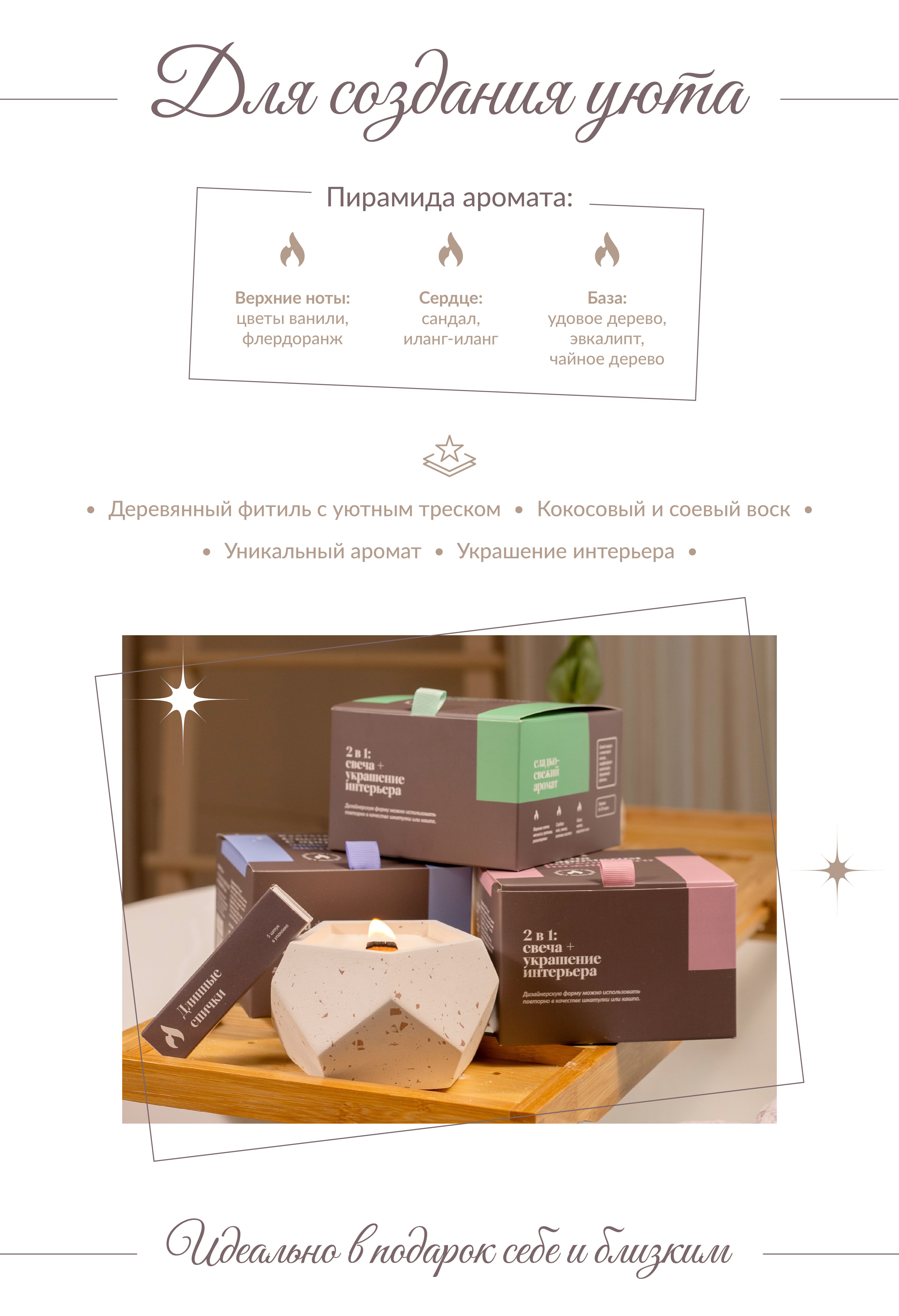Состав: бленд соевого и кокосового восков, парфюмерная композиция, деревянный фитиль с треском.