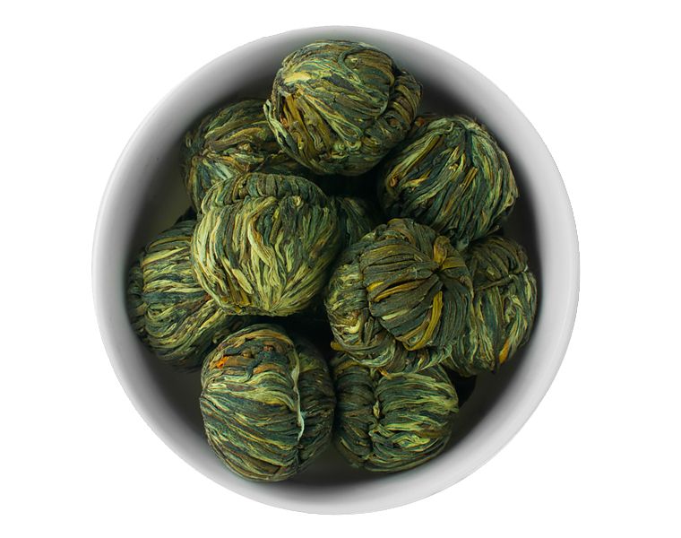 Связанный зелёный чай, который при заваривании раскрывается букетом с цветками жасмина и календулы. Настой чая по вкусу напоминает молодое белое вино, изготовленное из сладкого винограда.
