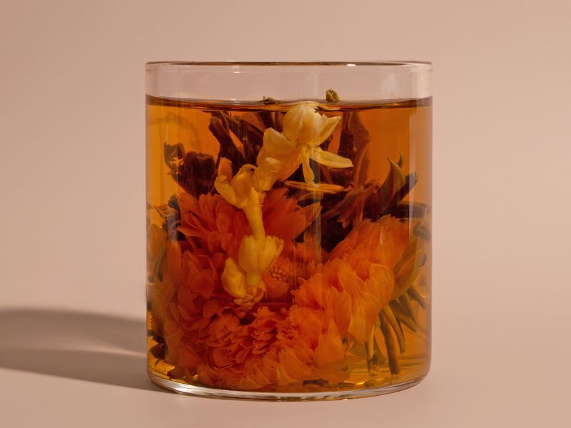 Оказавшись в воде, чай тонкими жемчужными нитями выпускает из себя весь воздух и начинает медленно раскрываться. Около трех минут требуется, чтобы затем из глубины чайного «букета» появился венок из жасминов, а после, как центр всей композиции, — цветок календулы.